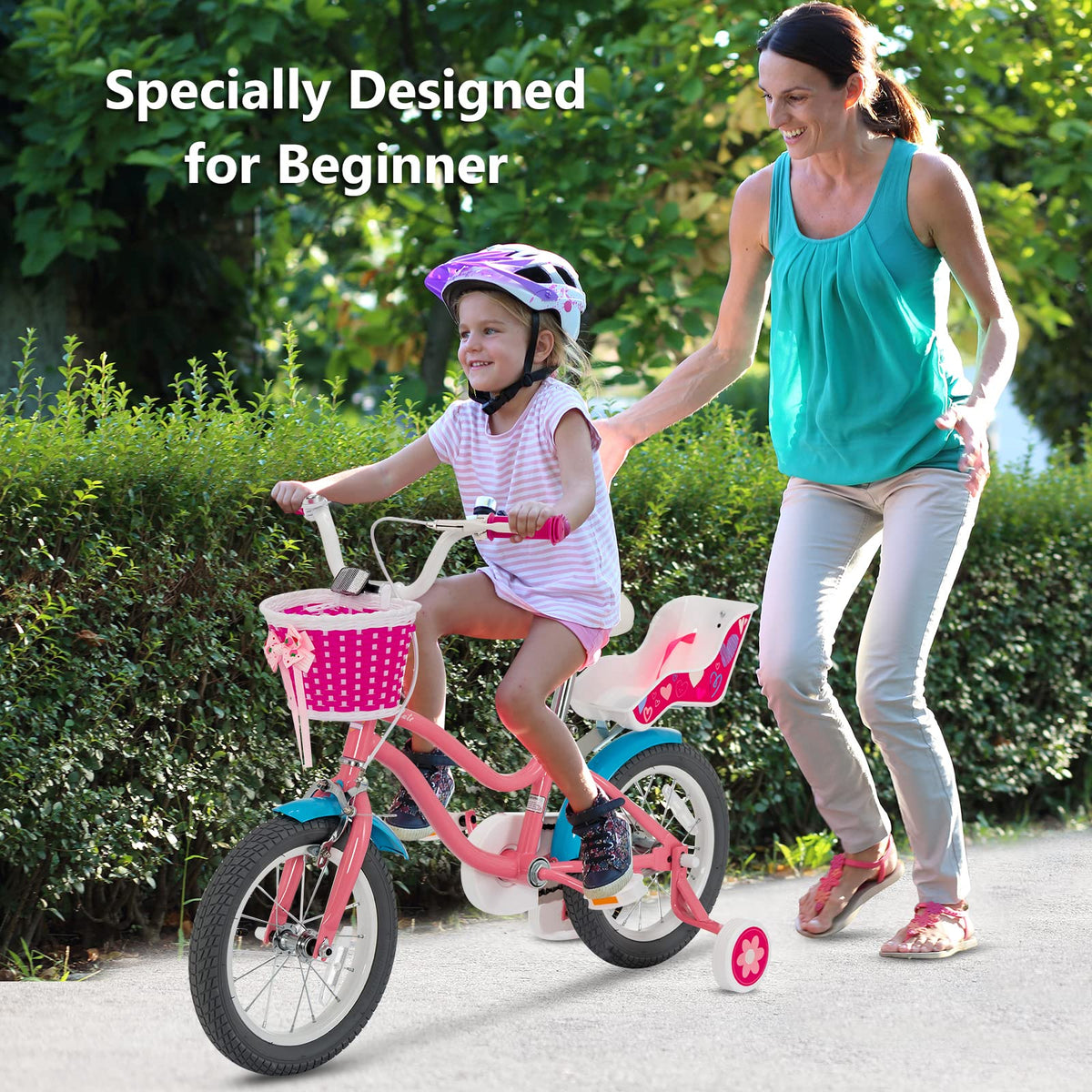 - 【Cute Look with Basket & Doll Chair】With lovely look and beautiful pink color, this kids bike will catch kid's eyes at first sight. Lovely doll chair for your little one to take favourite dolls everywhere. Please remember that the doll chair is not suitable for kids to sit. And front basket can store kid's toys, snacks, flowers, etc.
