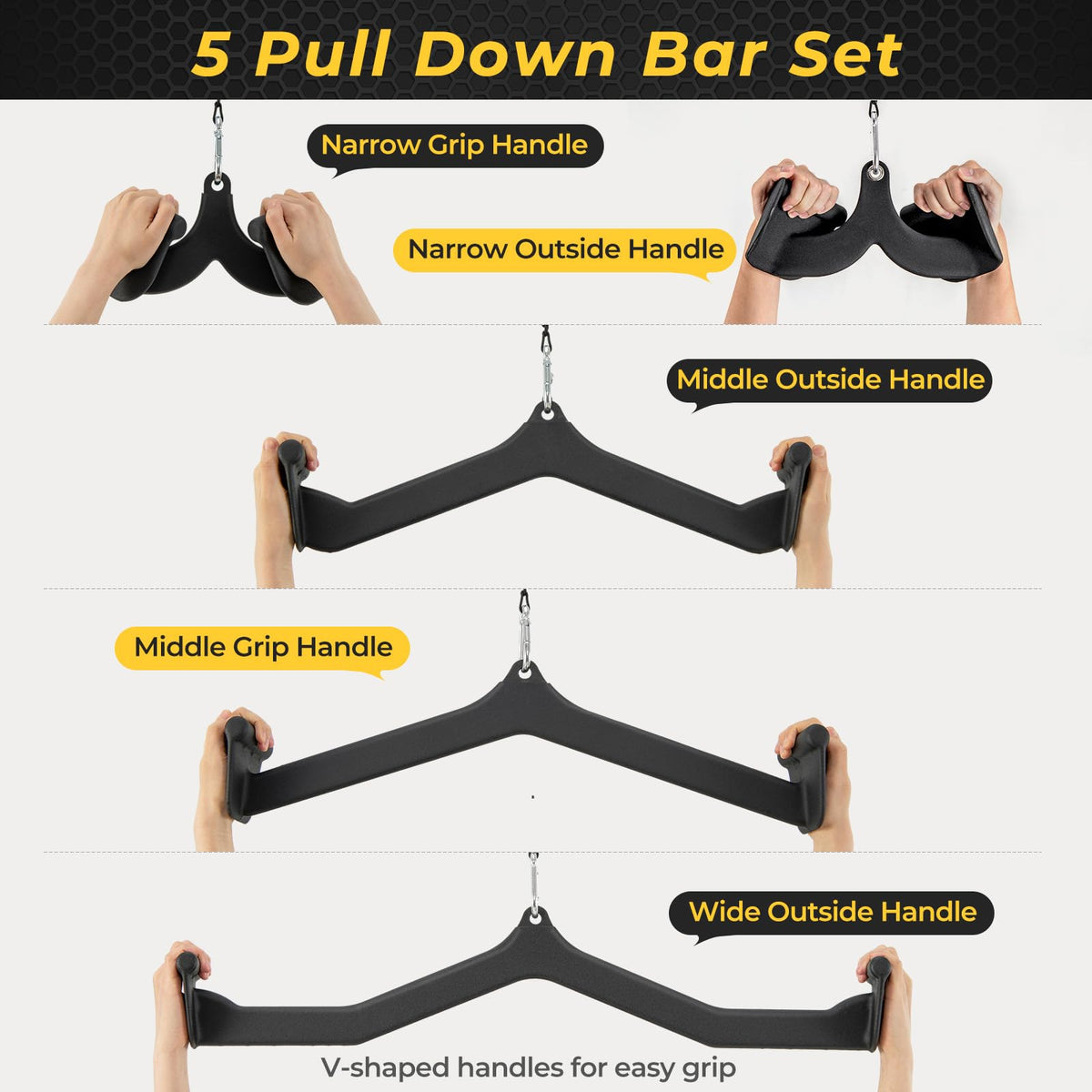 - 5 Pull Down Bar Set: This set of home gym accessories includes everything you need for a complete muscle-targeting workout. Additionally, the diverse rowing bar set includes multiple handle options for maximum training activities, including a narrow grip handle, a narrow outside handle, a middle outside handle, a wide outside handle, and a wide outside handle.
