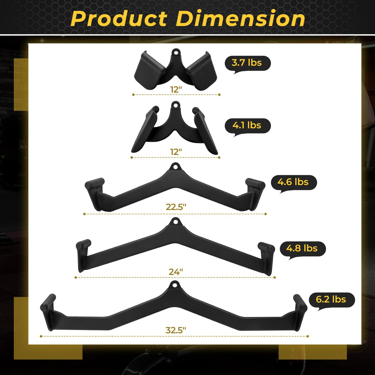 The 5-piece lat pulldown attachments set includes multiple bar handle options for a variety of workouts to effectively target different muscle groups. Equipped with secure and comfortable holders, this innovative set is perfect for building upper body strength and achieving your fitness goals. Moreover, constructed from high-quality metal material with premium coating, this set is durable and can withstand daily use. Furthermore, the thick metal bar and buckle make it easy to attach to various gym equipment.