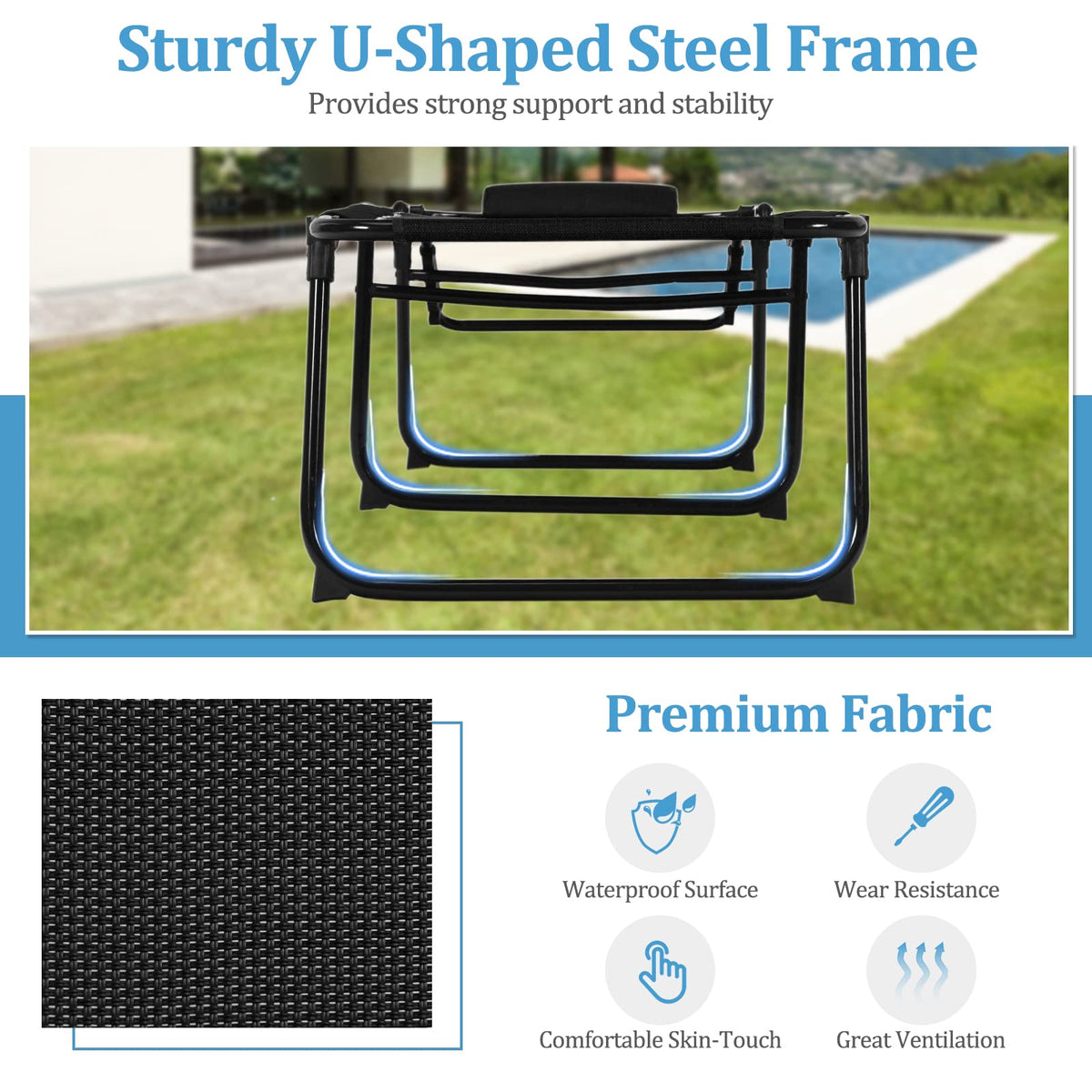 - Durable & Comfortable Material: The reclining chair is made of waterproof fabric with excellent wear resistance, comfortable skin touch, and great ventilation. Besides, the frame is consist of powder-coated steel tubes, firmly holding up to 330lbs