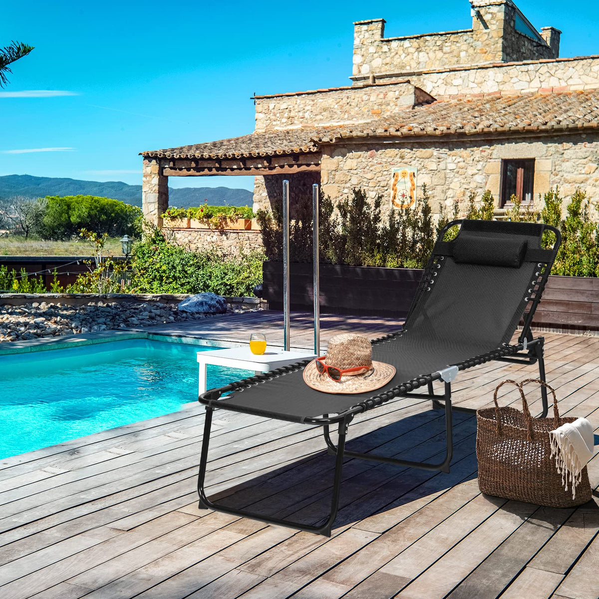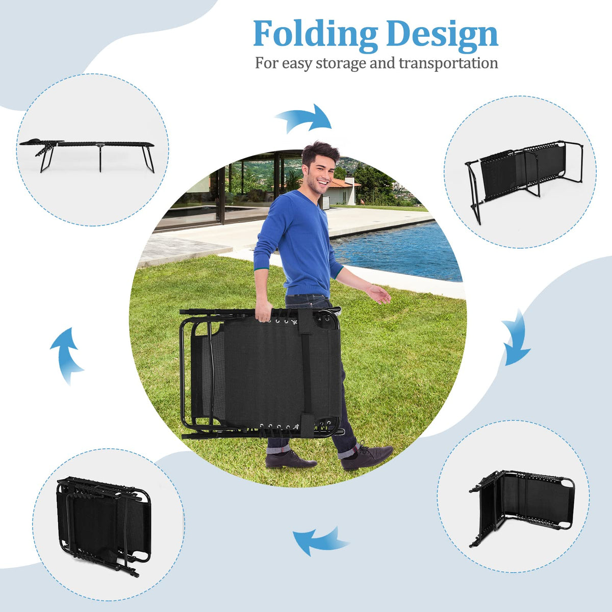 - Adjustable Backrest & Footrest: The folding chaise lounge is designed with a 4-level adjustable backrest and 2-level adjustable footrest, allowing you to recline, sit up or lie flat comfortably, and perfect for reading sunbathing or taking a nap.