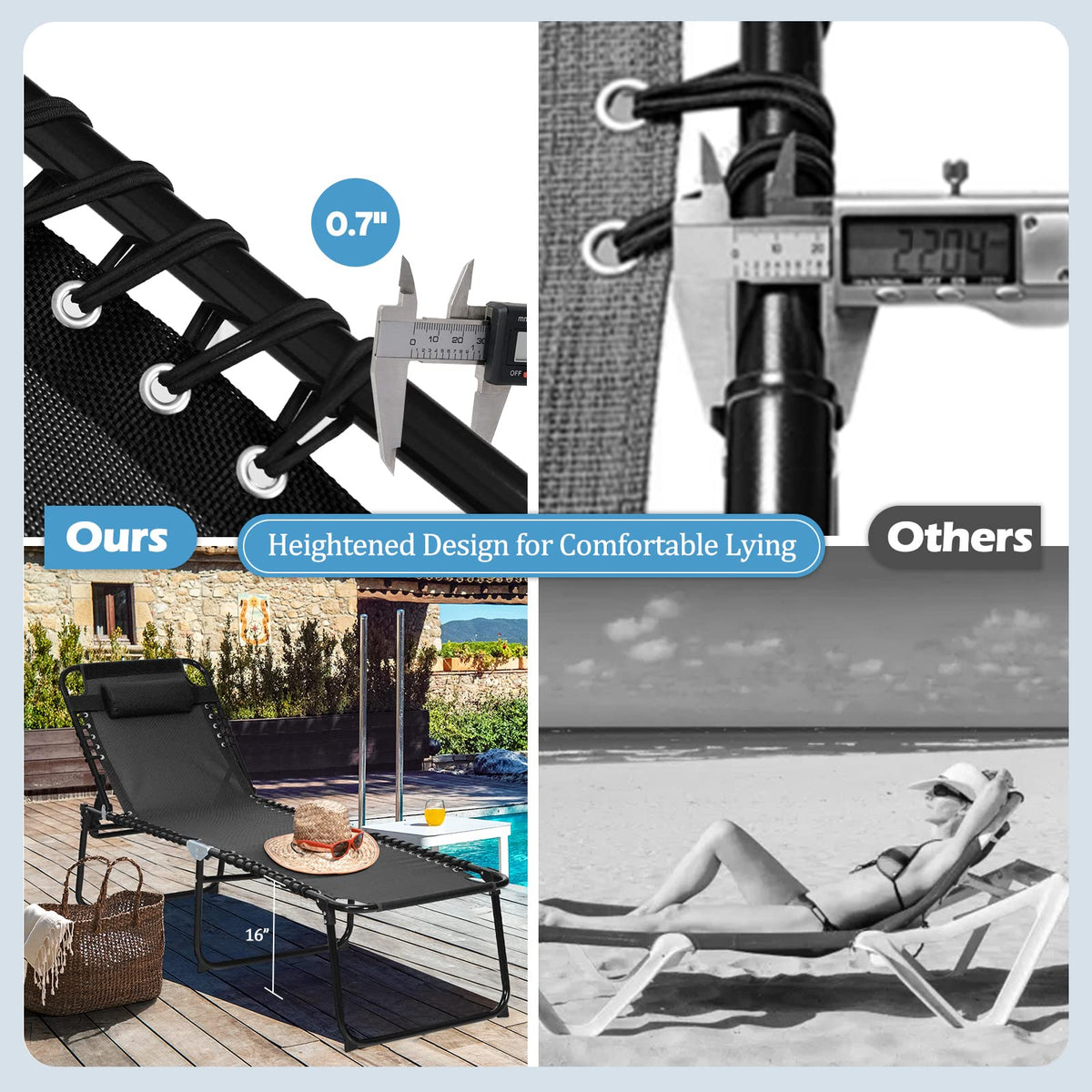 - Higher Chair & Stable Structure: 16" high chair is more comfortable to sit on and easier to stand up. Equipped with a sturdy U-shaped steel frame, the beach chair offers strong support and great stability. In addition, the anti-skid and anti-sink foot pads make the lounge chair stable on mud or sand.