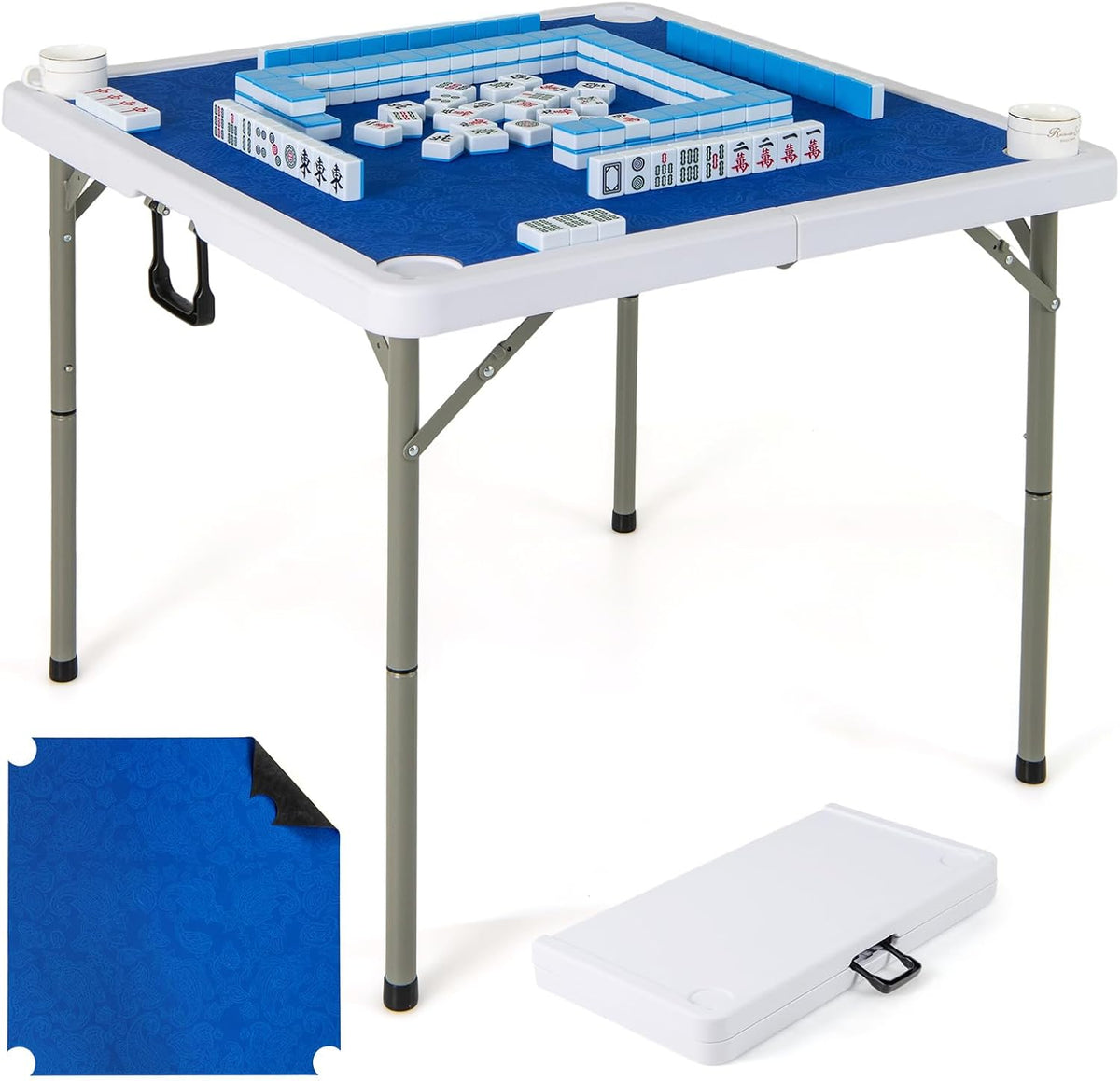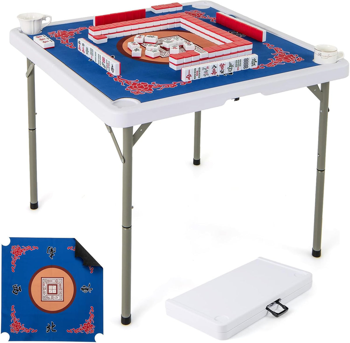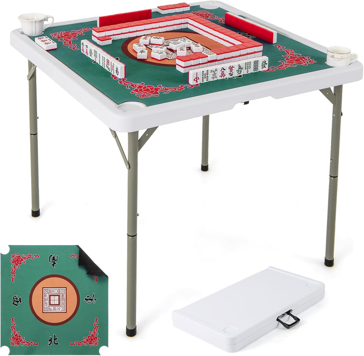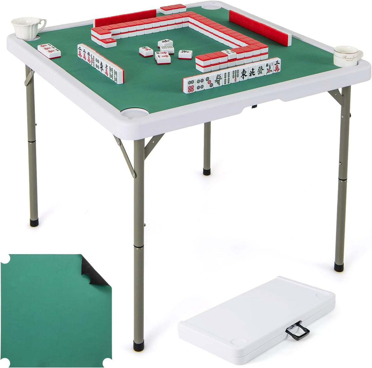 This versatile 35” folding mahjong table is perfect for game lovers! Designed for up to 4 players, it features a premium HDPE tabletop that resists wear and tear, ensuring long-lasting use. The included roll-up gaming mat provides a smooth, anti-slip surface with noise reduction, ensuring easy card handling and dice rolling. The 4 built-in cup holders keep drinks within reach and minimize spills during gameplay. Whether for family game nights, parties, or outdoor picnics, this folding game table is ideal for mahjong, poker, dominoes, and more. Its folding design with a built-in handle makes setup and storage easy, offering ultimate portability for any occasion.