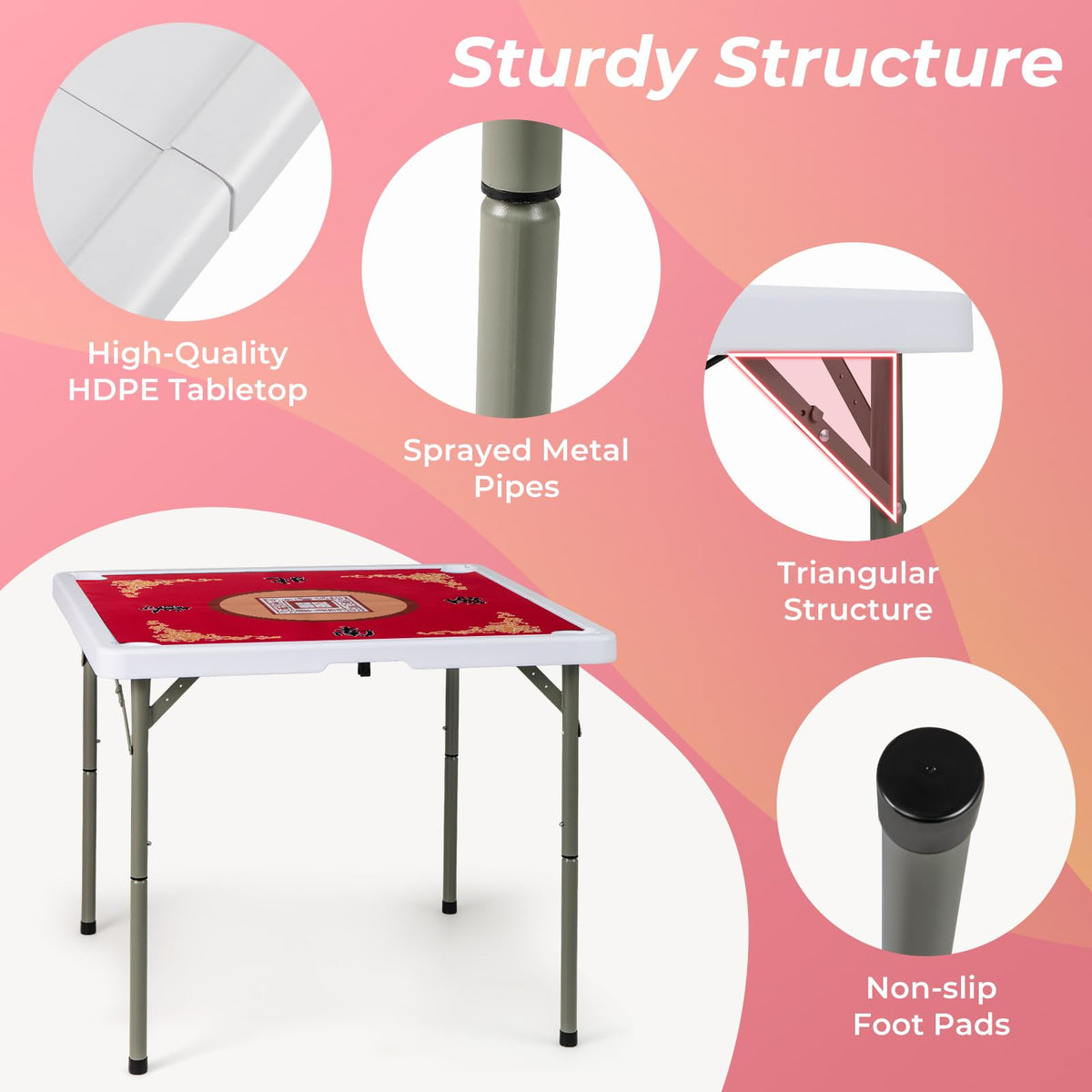 - HDPE Tabletop & Sturdy Structure: Made with a high-quality HDPE tabletop, this card game table resists wear and tear for long-lasting use. It is suppered by sturdy metal legs with triangular structure to ensure stability. Non-slip foot pads enhance stability while protecting your floor from scratches.