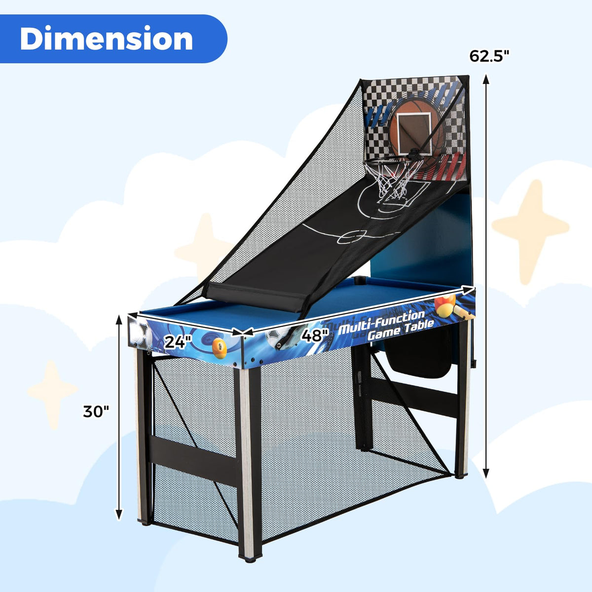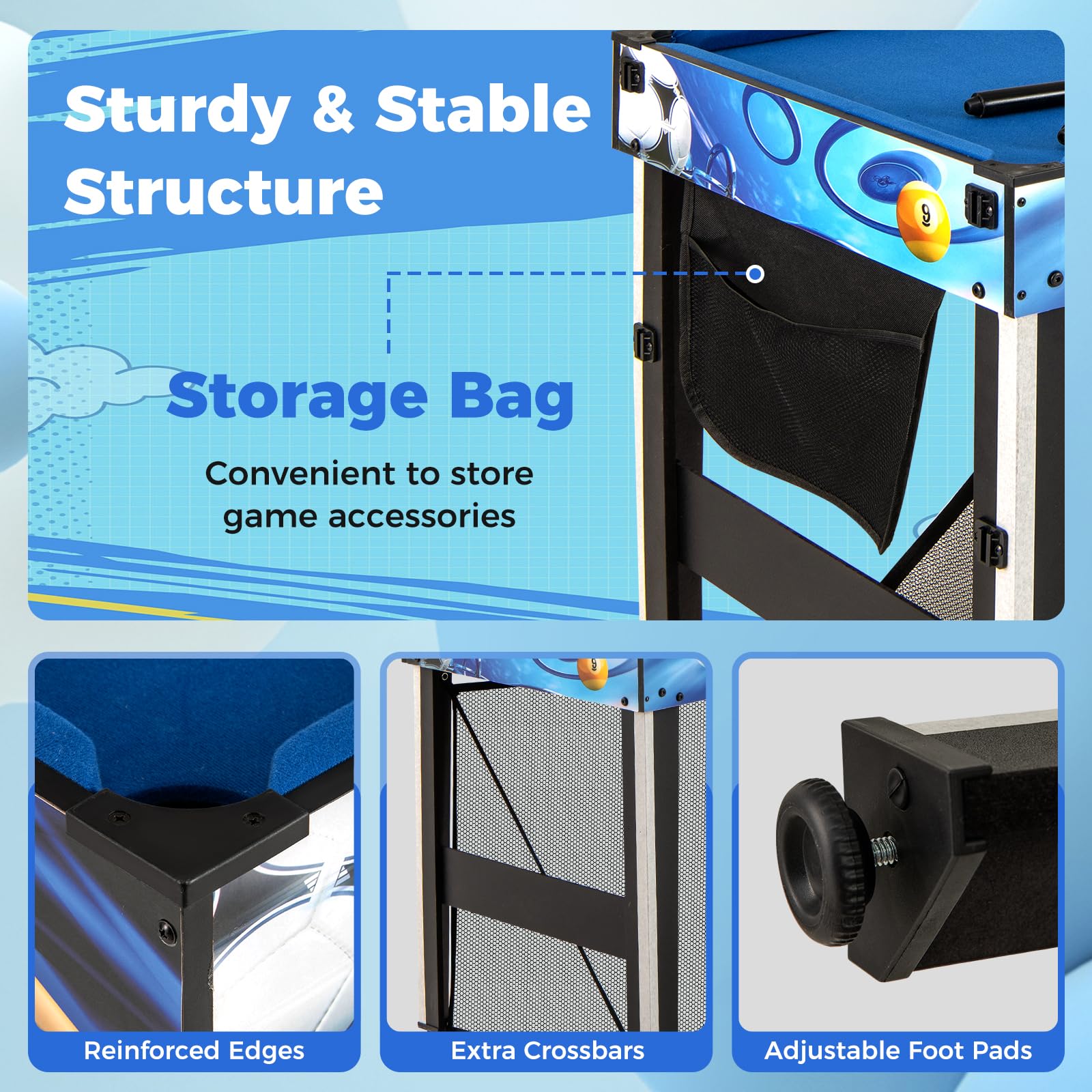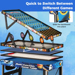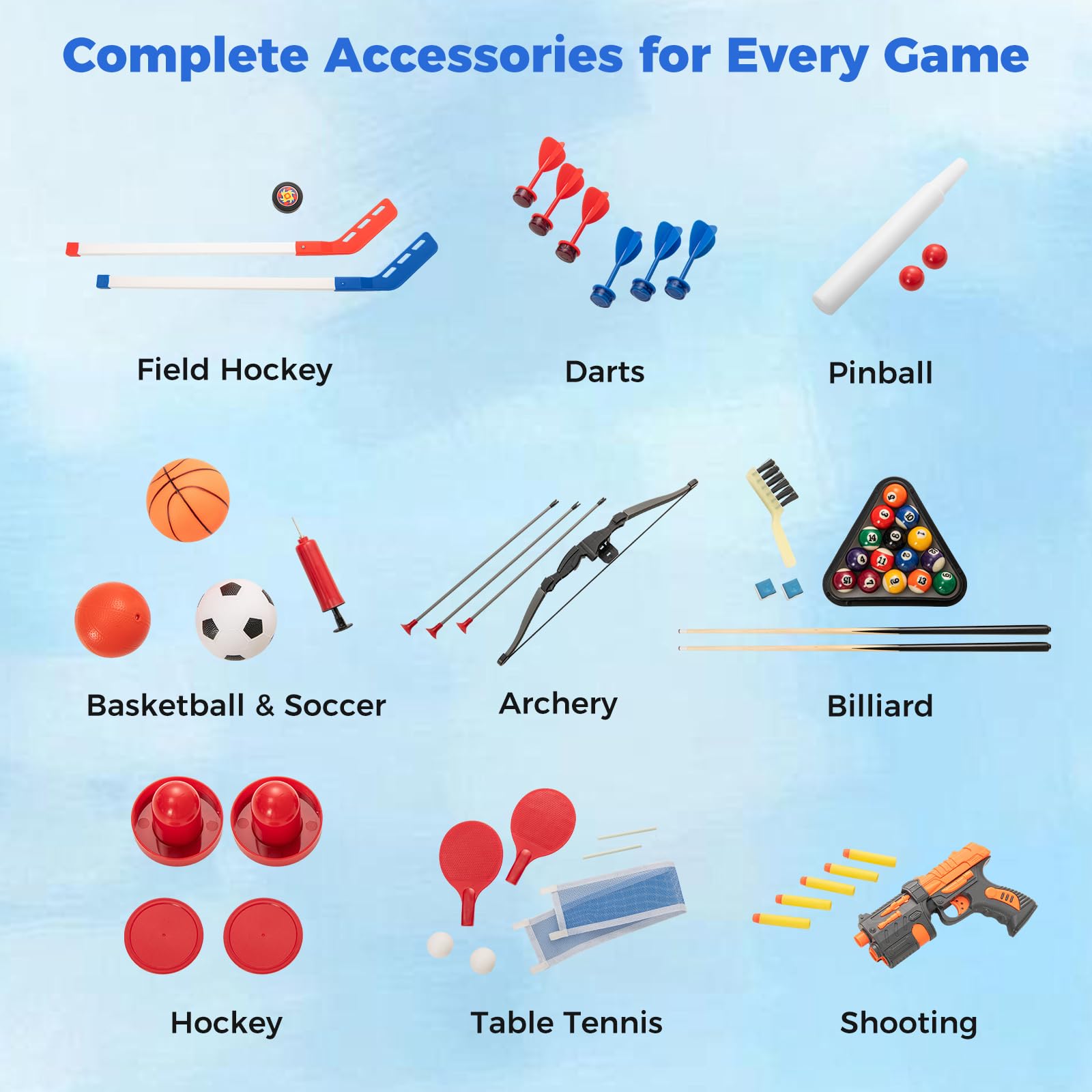 Offering a diverse selection of sports options including billiards, hockey, table tennis, and more, this game table set is perfect for family gatherings and game nights, catering to various age groups. Each game comes with its complete set of accessories, ensuring you are always game-ready for quick action. Effortlessly switch between games with the user-friendly setup that requires no tools. The sturdy build of the table features adjustable foot pads for stability.