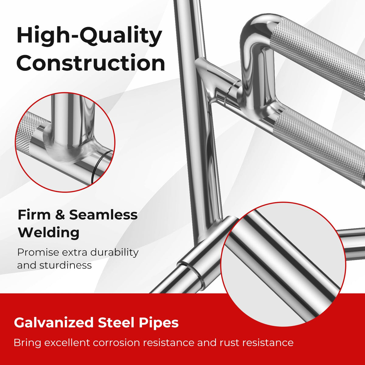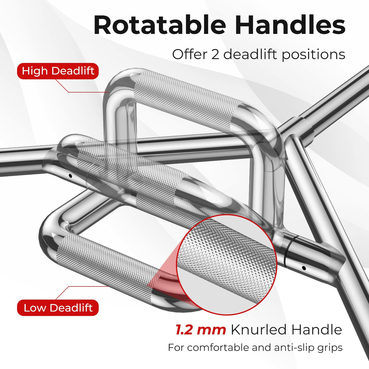 - 2 Different Grip Positions w/ Knurled Handles: Made of a tough and coarse texture that is cut in a diamond pattern on stainless steel grab bar. This hex bar features dual knurled handles that are designed to increase the friction and provide you a sturdy and comfortable grip when lifting heaving equipment.