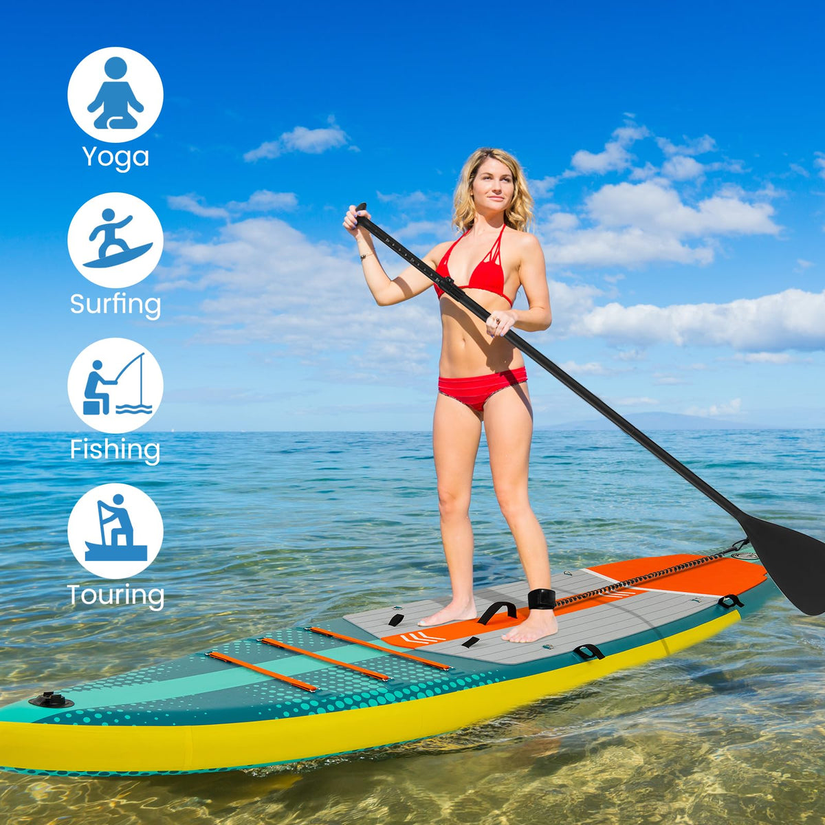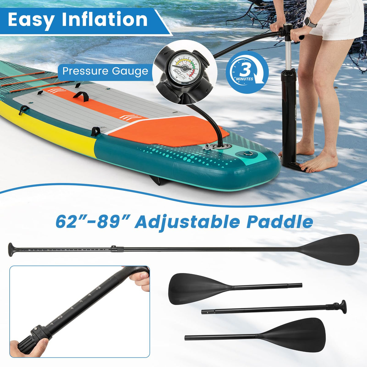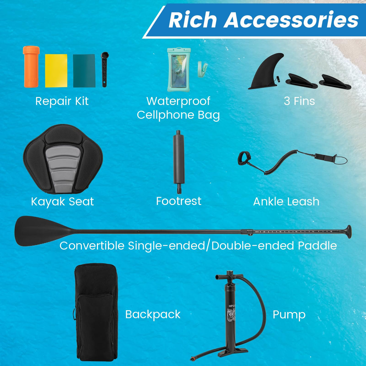 Equipped with a removable seat and a comfortable footrest, the paddle board effortlessly transforms into a kayak, adding a new dimension to your water sports experience. The stand up paddle board is designed with reinforced PVC sidewalls and a drop stitch core, ensuring a long-lasting and sturdy structure. Equipped with a retractable double-ended paddle, the SUP allows you to glide through the water with ease. The inclusion of 2 side fins and a center fin enhances stability and maneuverability, making it a breeze to navigate different water conditions. Whether you're a beginner or an experienced paddler, this board caters to all levels. In addition, the non-slip EVA pad offers exceptional traction, giving you the confidence to push your limits. The manual hand pump allows for quick inflation and deflation, while the backpack promotes effortless transportation.