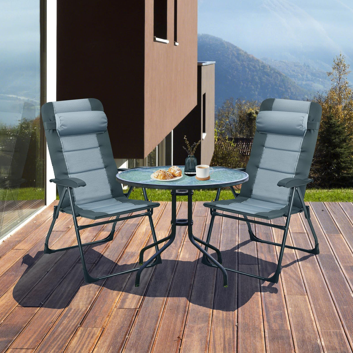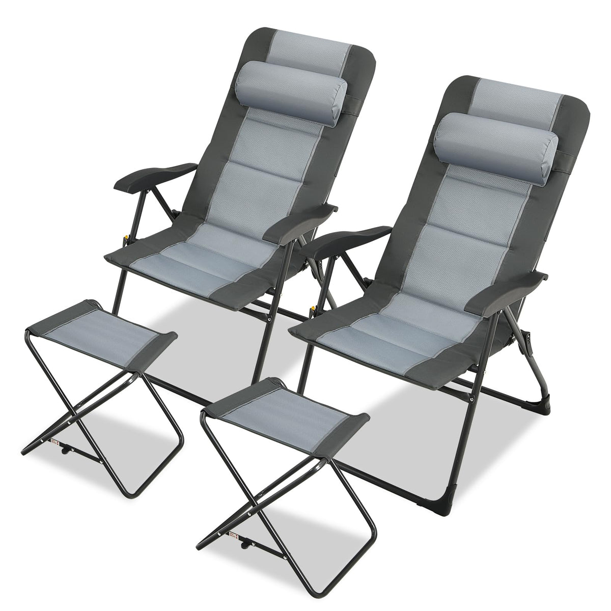 Indulge in cozy lounging experience with the 7-level adjustable backrest and padded seats with durable Oxford and polyester mesh. The sturdy metal frames ensure great weight capacity, while anti-slip footpads improve overall stability. This set is delightfully portable, with a compact folding design and ottomans that tuck into the chair’s back pockets. Whether for camping or backyard gatherings, this set promises a stress-free leisure time.