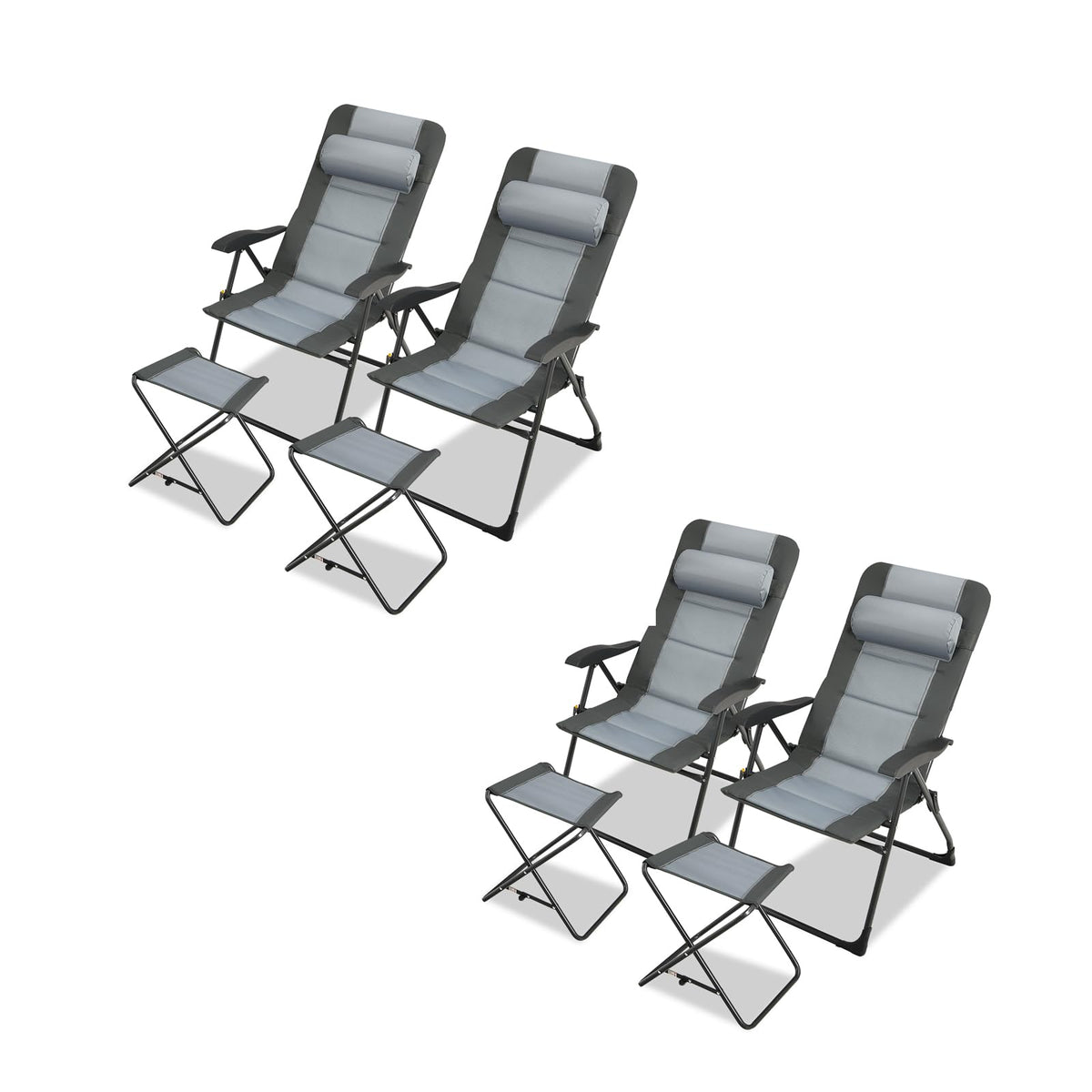 - Portable Folding Chair Sets: The recliner chair and the ottoman are both foldable with compact footprint, effortless to store or carry for trips. Moreover, the footstools fit into the large back pockets of chairs for added convenience.