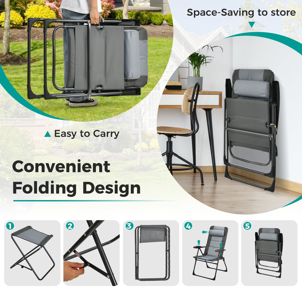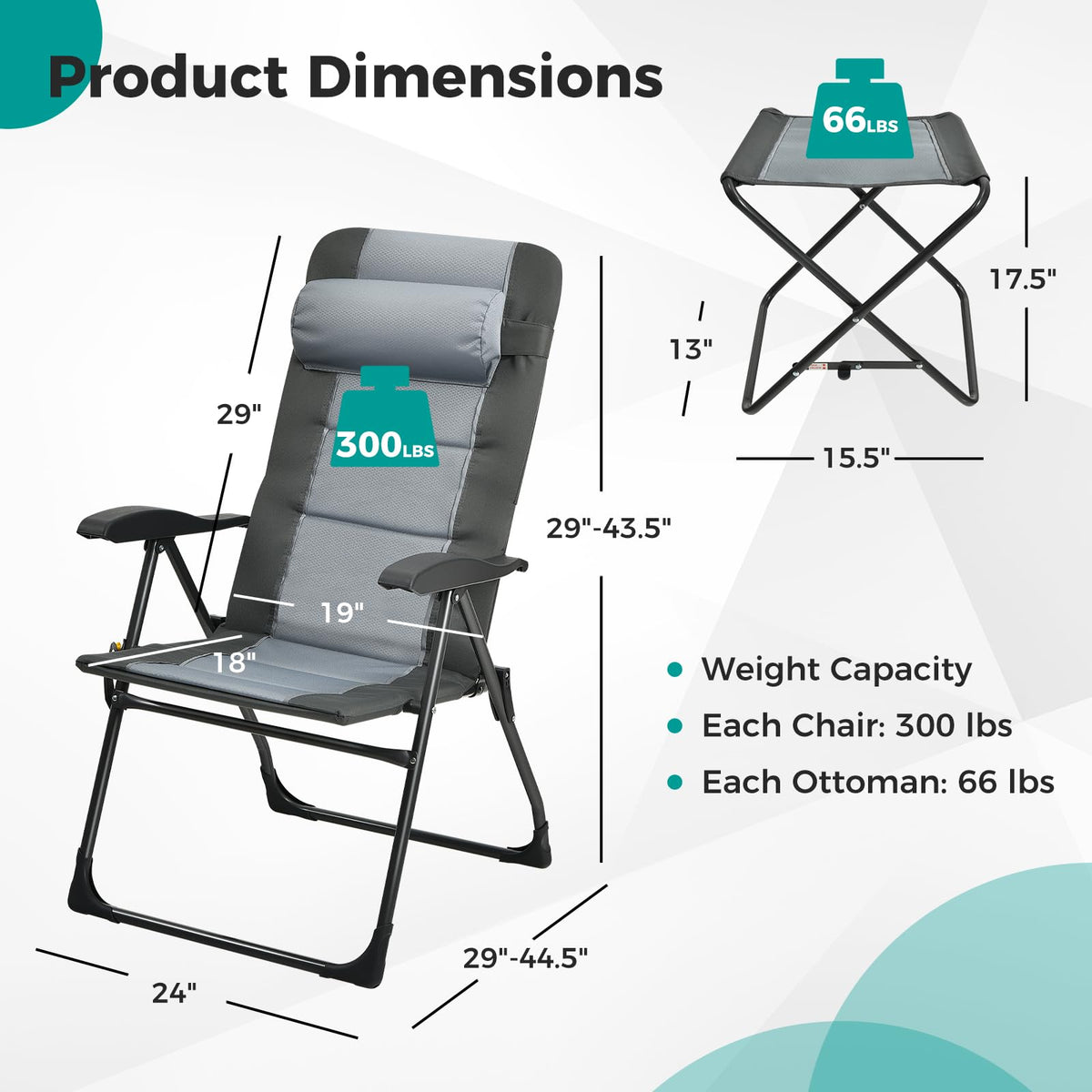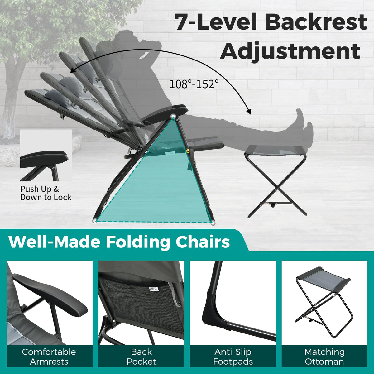 - Patio Furniture Combo: Coming with 2 set of recline chair with ottoman, GYMAX folding chair combo would offer you ultra comfortable lounge experience. Perfect for both indoor and outdoor, this recliner chair set can be used as dinning chairs or relaxing lounge chair, and the foldable stools are also versatile.