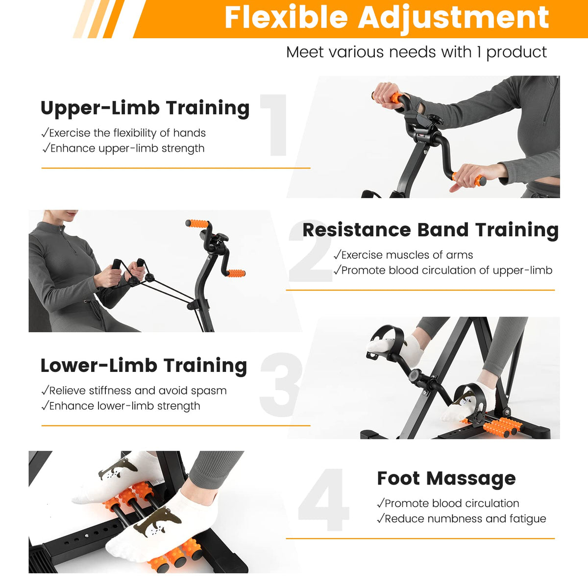 - Multiple Exercise Modes: This pedal exercise offers full-body workout: upper-limb training, resistance band training and lower-limb training. The low-impact exercise can improve joint flexibility, enhance muscle strength, promote blood circulation and more. Upgraded with massage function, this exercise equipment can also massage hands and feet.