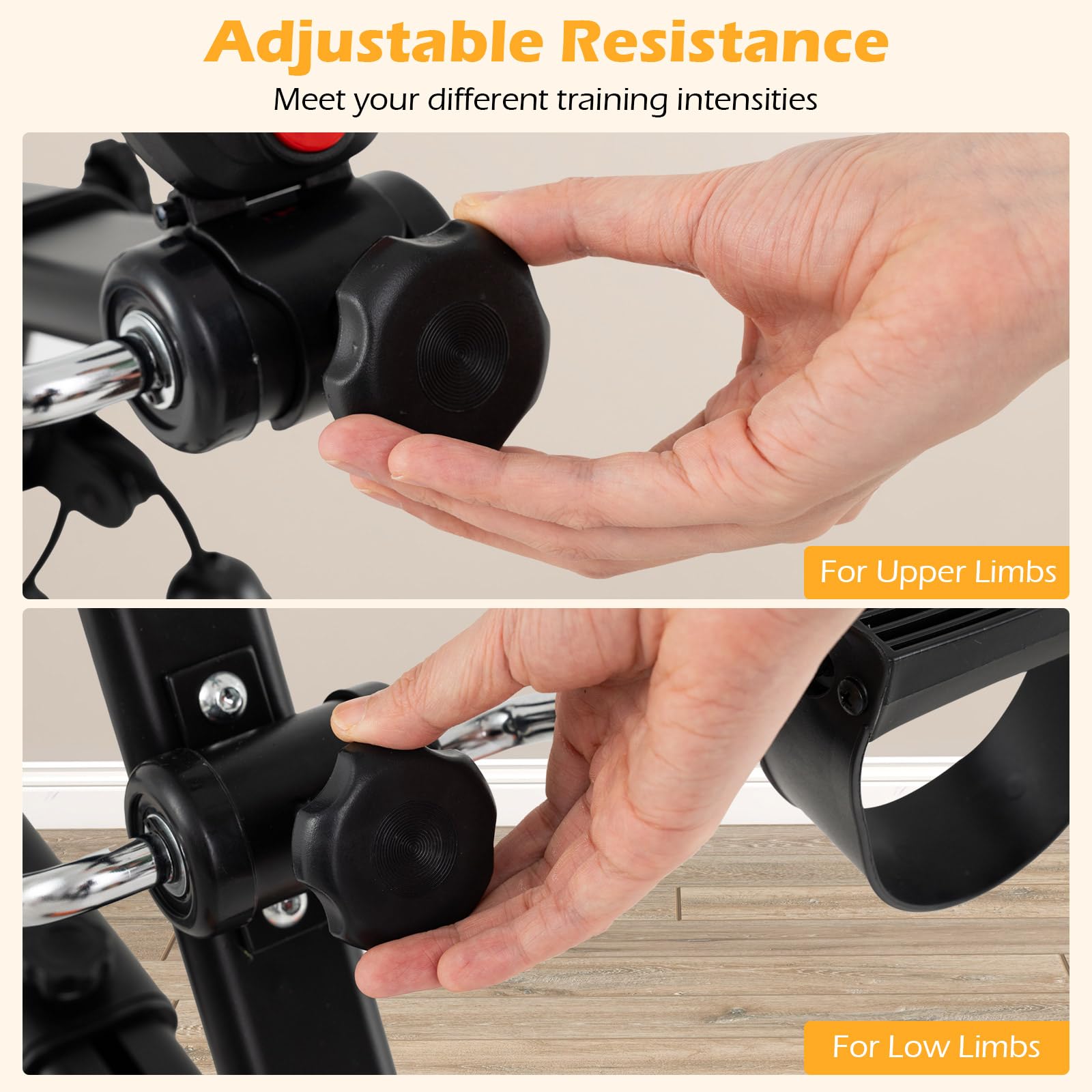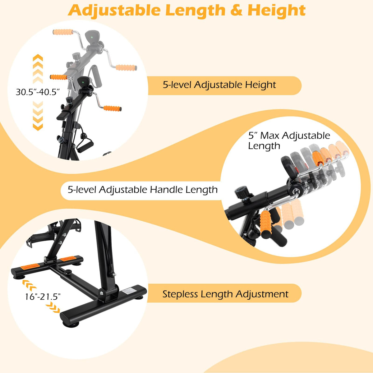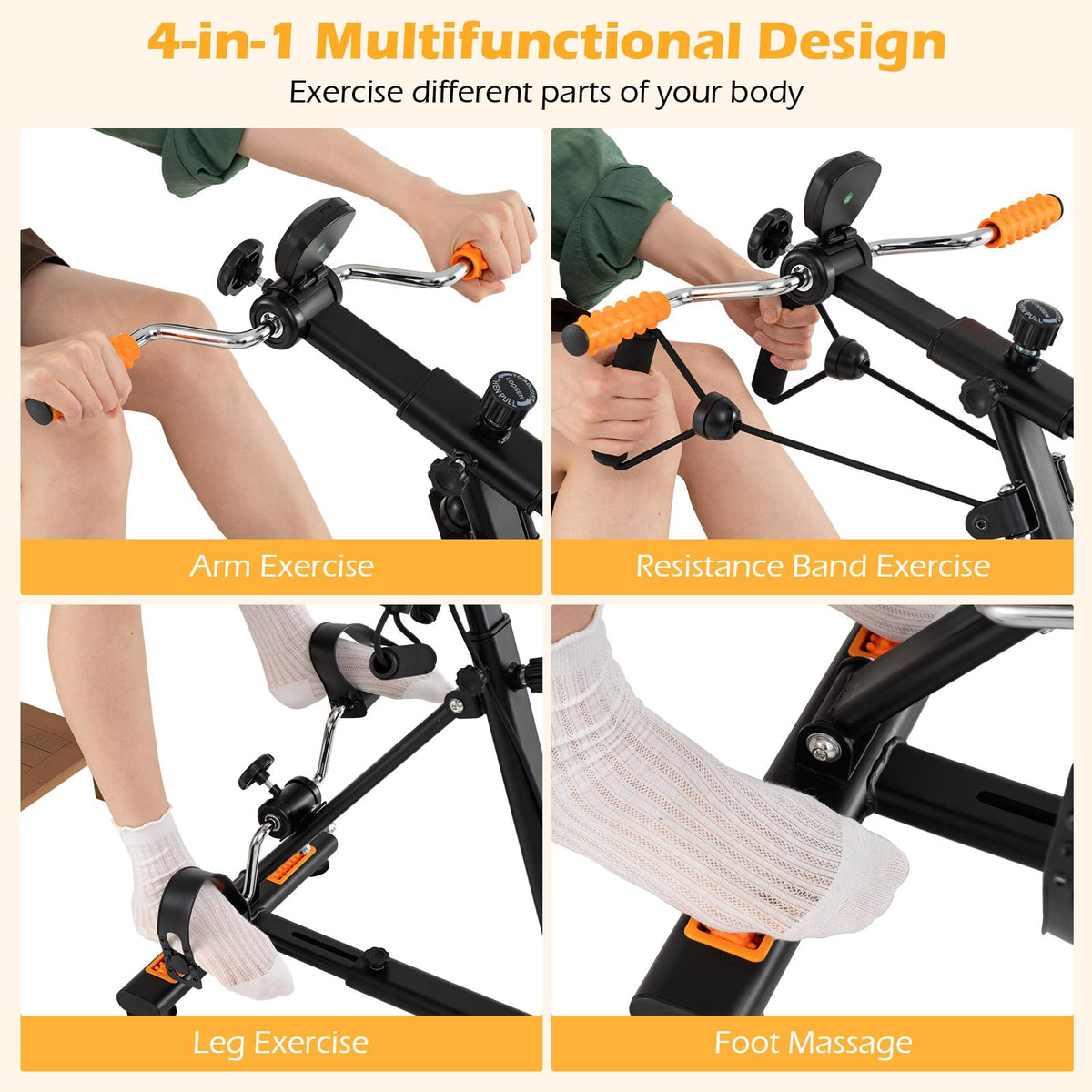 Are you looking for a convenient way to stay fit at home? This pedal exerciser is a fantastic choice. It offers a 4-in-1 design for versatile workouts, including arm, resistance band, leg exercises, and foot massage. It is constructed with thickened metal pipes and a stable triangular structure, as well as non-slip foot pads for safety. Additionally, the massage rollers target acupoints to improve circulation and reduce stress. The LCD monitor tracks your progress, showing time, distance, calories, and counts. Plus, with 5-level height and handle length adjustments, plus stepless base length modifications, it fits users of all sizes. Whether you're aiming to build muscle, aid in physical rehabilitation, or simply stay active during downtime, this pedal exerciser is an excellent choice for a healthier lifestyle, making it a fantastic gift for anyone who values wellness.