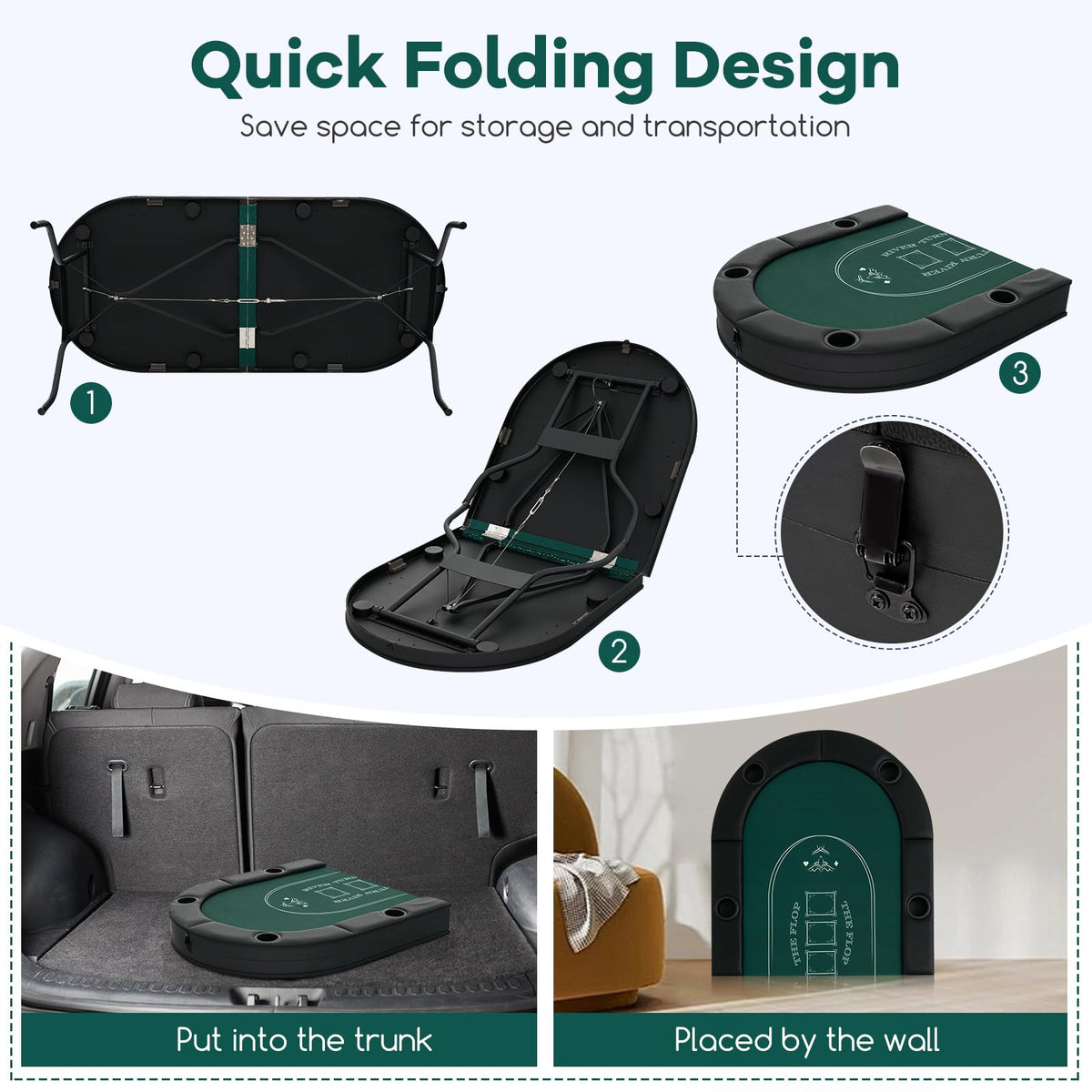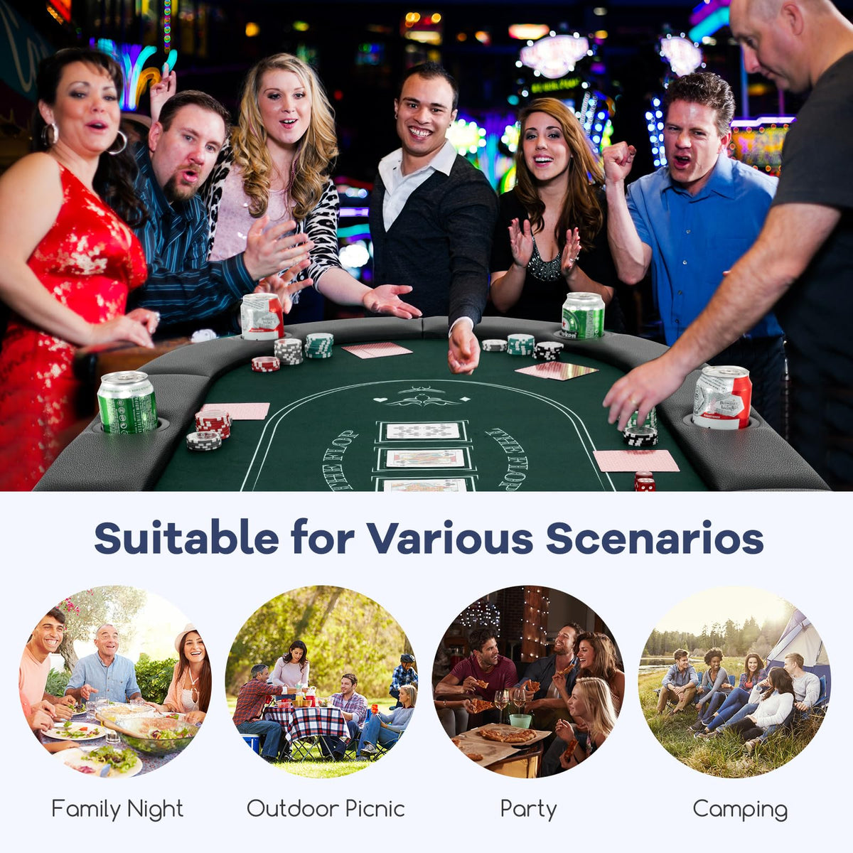 Are you looking for the premium poker table that combines convenience, style, and stability? Look no further! Our 8-person poker table features a quick folding design, allowing for easy storage and transportation. With convenient built-in deep metal cup holders, keeping your drinks secure during gameplay has never been easier. Additionally, the stable triangular structure, reinforced with reliable steel cables and non-slip foot pads, ensures long-lasting durability. For extra comfort, this poker table comes with a smooth felt surface and comfortable padded armrests. Hence, this versatile game table is perfect for a variety of scenarios including family nights, outdoor picnics, parties, and camping trips. Get ready for unforgettable game nights with this premium 8-player poker table.