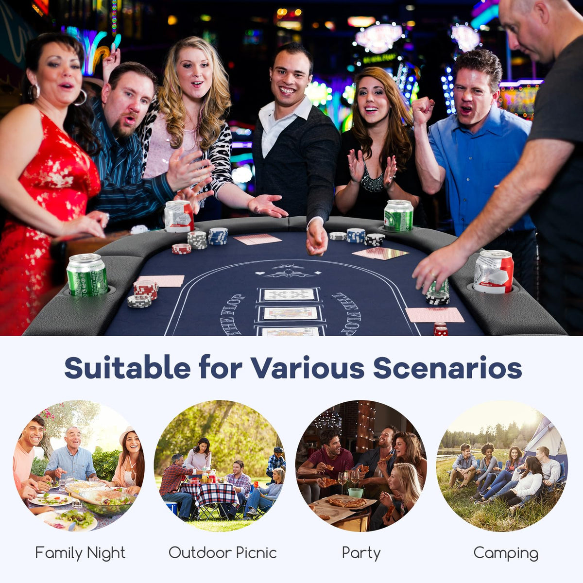 Are you looking for the premium poker table that combines convenience, style, and stability? Look no further! Our 8-person poker table features a quick folding design, allowing for easy storage and transportation. With convenient built-in deep metal cup holders, keeping your drinks secure during gameplay has never been easier. Additionally, the stable triangular structure, reinforced with reliable steel cables and non-slip foot pads, ensures long-lasting durability. For extra comfort, this poker table comes with a smooth felt surface and comfortable padded armrests. Hence, this versatile game table is perfect for a variety of scenarios including family nights, outdoor picnics, parties, and camping trips. Get ready for unforgettable game nights with this premium 8-player poker table.