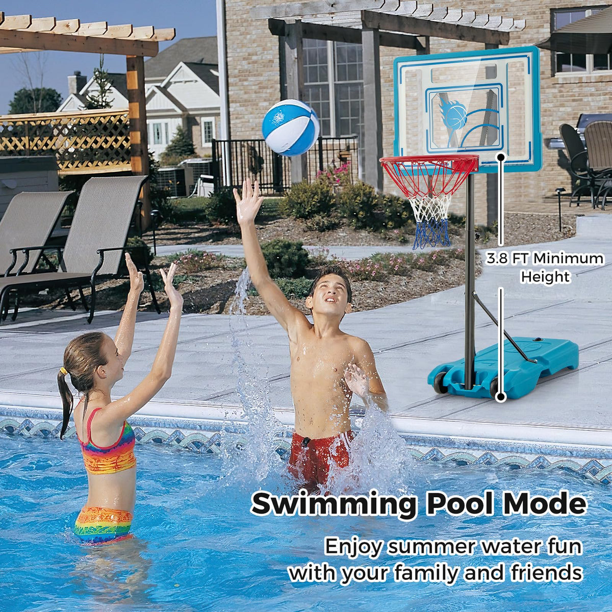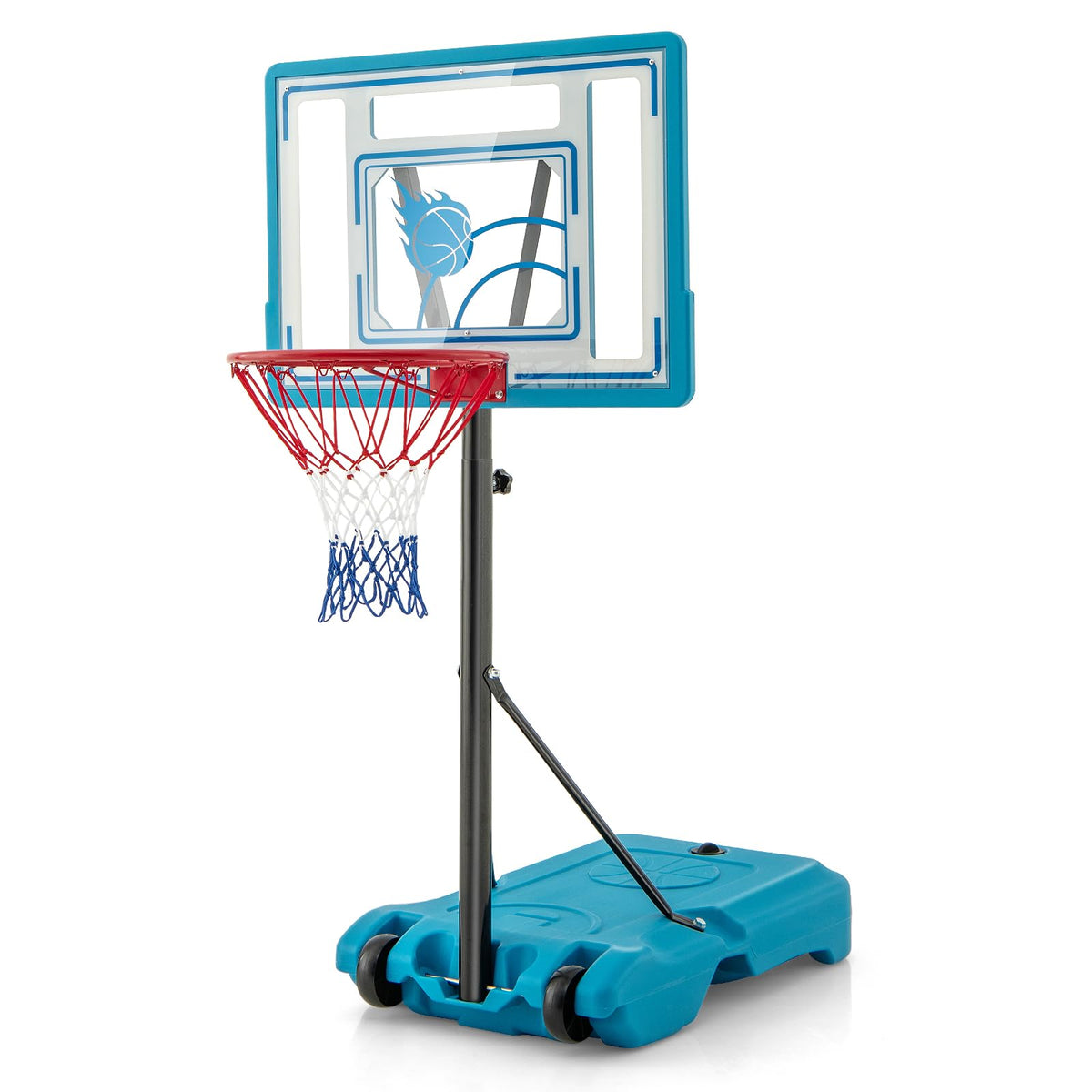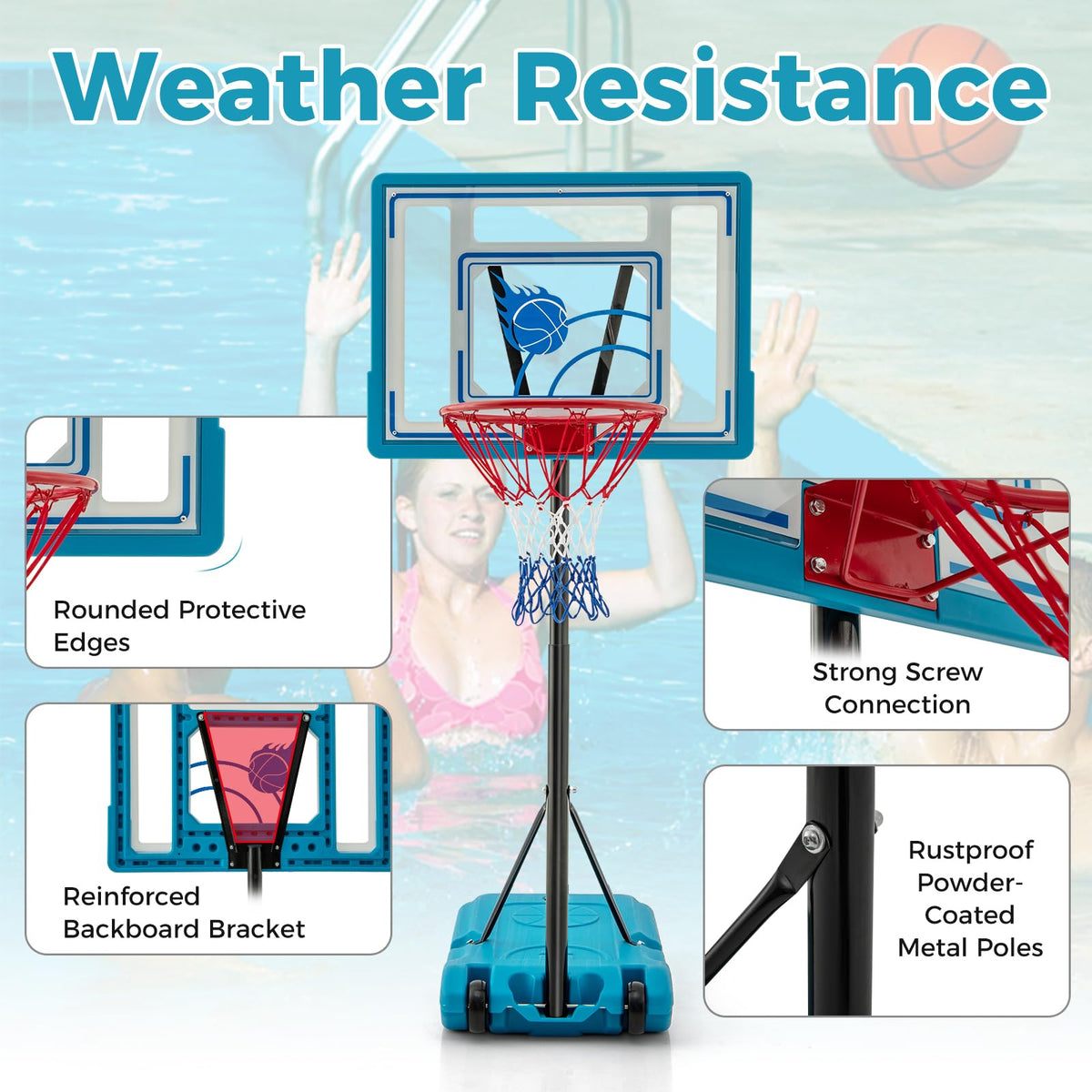 The 3.8-4.4 ft adjustable height range allows for fun poolside games. The sturdy HDPE base, fillable with water or sand, ensures stability and prevents tipping.during intense matches. Easily transportable with 2 built-in wheels, this basketball hoop system is perfect for indoor and outdoor use in various locations like your game room, poolside, or backyard. With a shatterproof backboard, heavy-duty rim, and anti-tear net, this basketball hoop is built for long-lasting use.