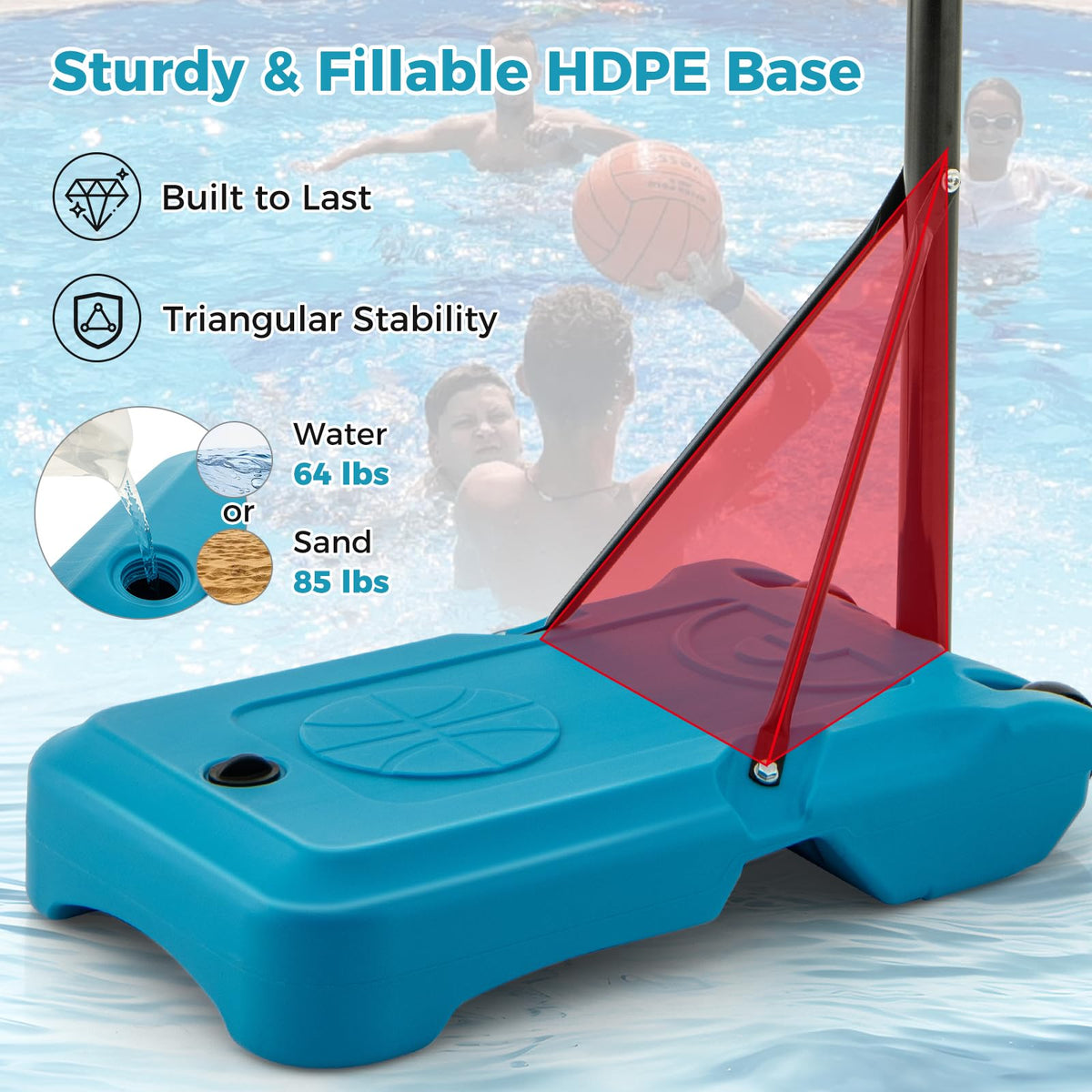 - Sturdy & Fillable HDPE Base: The large base can be filled with 64 lbs of water or 85 lbs of sand to ensure the hoop stays securely in place, providing stability during intense poolside games. The triangular structure is designed to prevent tipping that adds to safety.