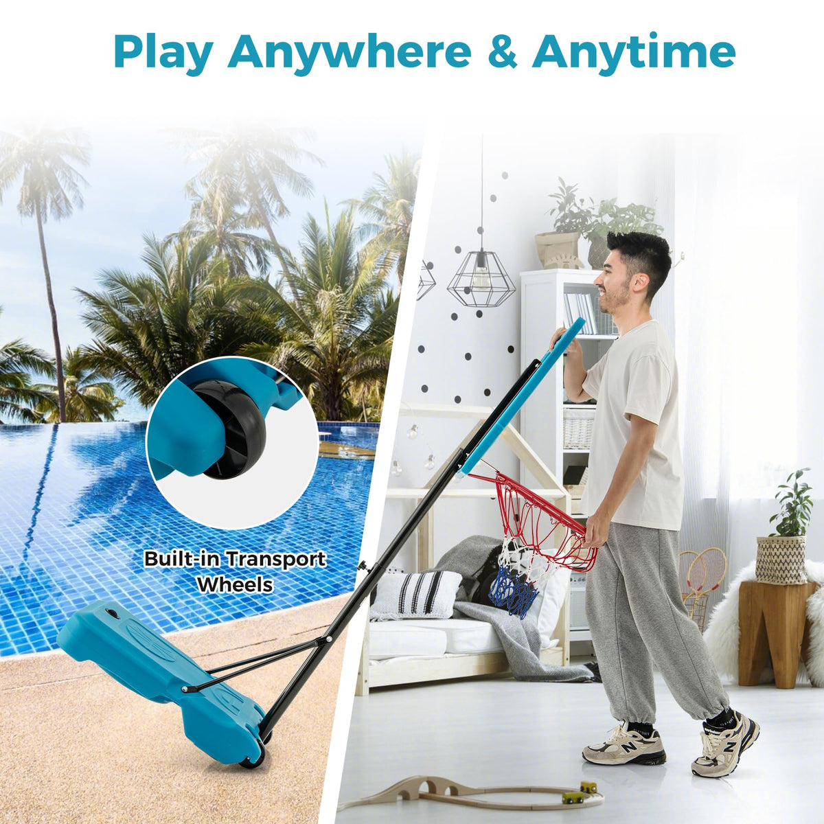- Play Anywhere & Anytime: Equipped with 2 built-in transport wheels, this basketball hoop for pool can be easily moved to different locations for versatile gameplay. It is suitable for various indoor and outdoor settings, such as your game room, poolside, backyard, etc..