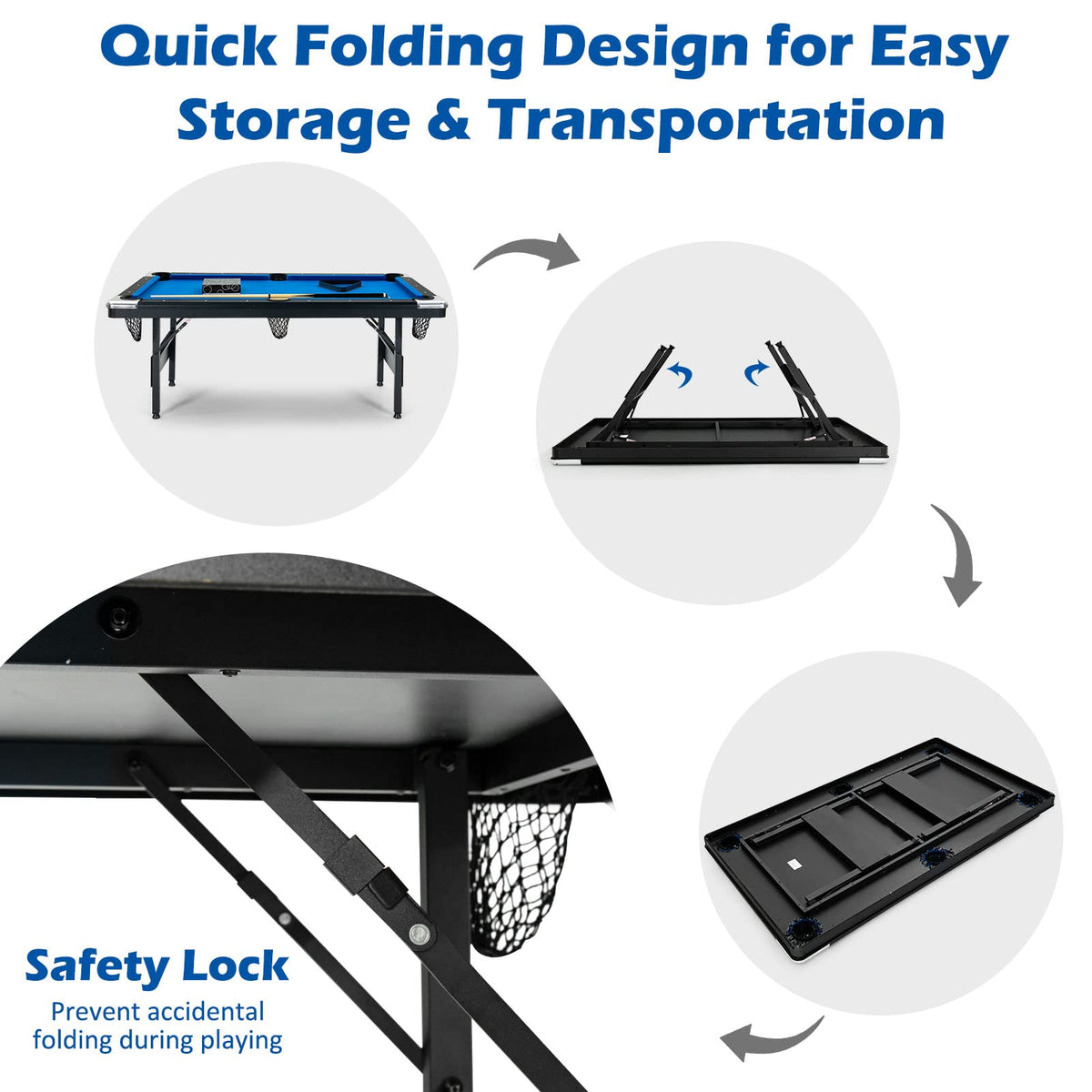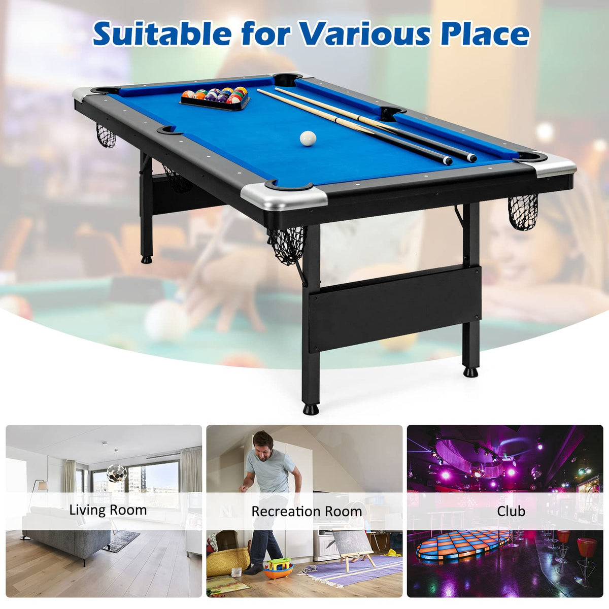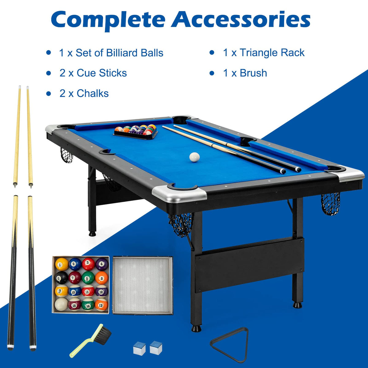 GYMAX Pool Table, 6FT Foldable Billiard Table with Complete Set of Balls, 2 Cue Sticks, Chalk & Felt Brush