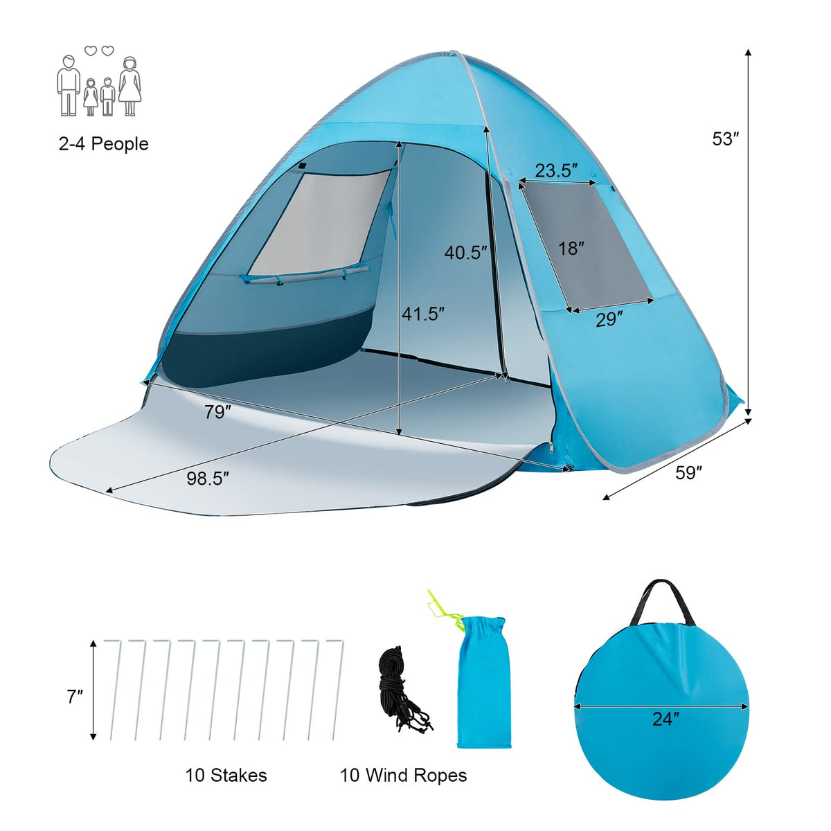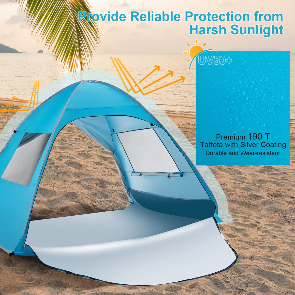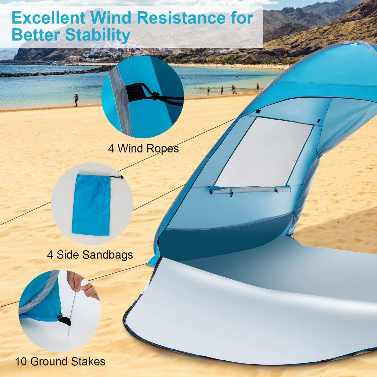 - Easy Setup & Stable Tent: The quick pop-up mechanism allows this beach tent to be set up in seconds! No additional assembly is needed. In addition, we provide 4 sandbags, 10 ground stakes and 4 wind ropes to provide stronger support for the beach tent in windy weather.