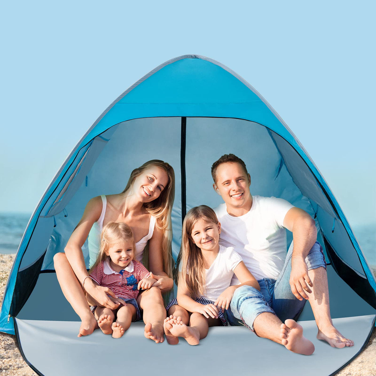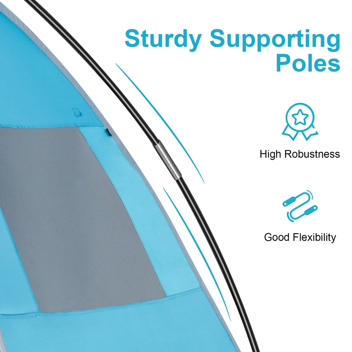 This beach tent provides ample space for 2 adults and can accommodate 2 kids for family camping, picnics, and fishing in outdoors. This easy setup pop up tent is lightweight enough to pack in the carry bag. And it can be set up in seconds for quick shade protection. And the structure of the tent is supported by flexible and strong fiberglass poles, which is very sturdy. In addition, there are two double sided zippered doors for easy access and bright view. The front door can be opened to serve as an extended floor, which not only provides good ventilation, but also expands your space for activities. And when the zipper door is closed, you can get good privacy protection. Besides, there are also two windows on both sides of the beach tent that can be quickly opened and closed with easy-to-use hook and loop fasteners, providing you with a more comprehensive view.