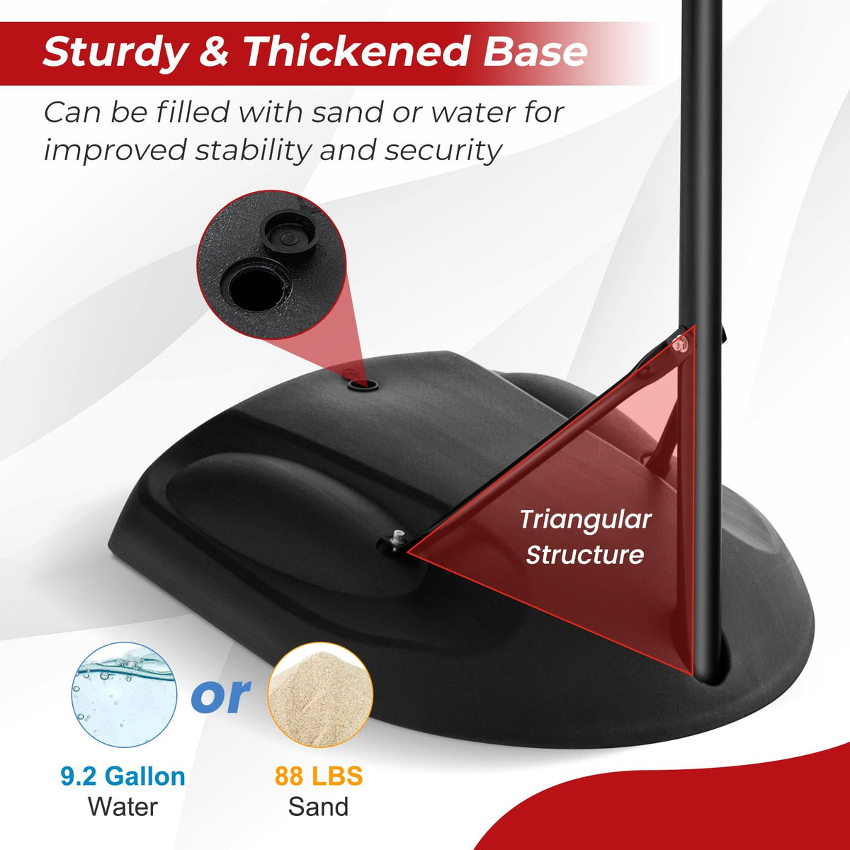 - Sturdy & Thickened Base: The heavy-duty PE base can be filled with 88 lbs of sand or 9.2 gallon of water for improved stability and security. Plus, the base is firmly attached to the main pole through a stable triangular structure, which is not easy to break or bend after long-time use.