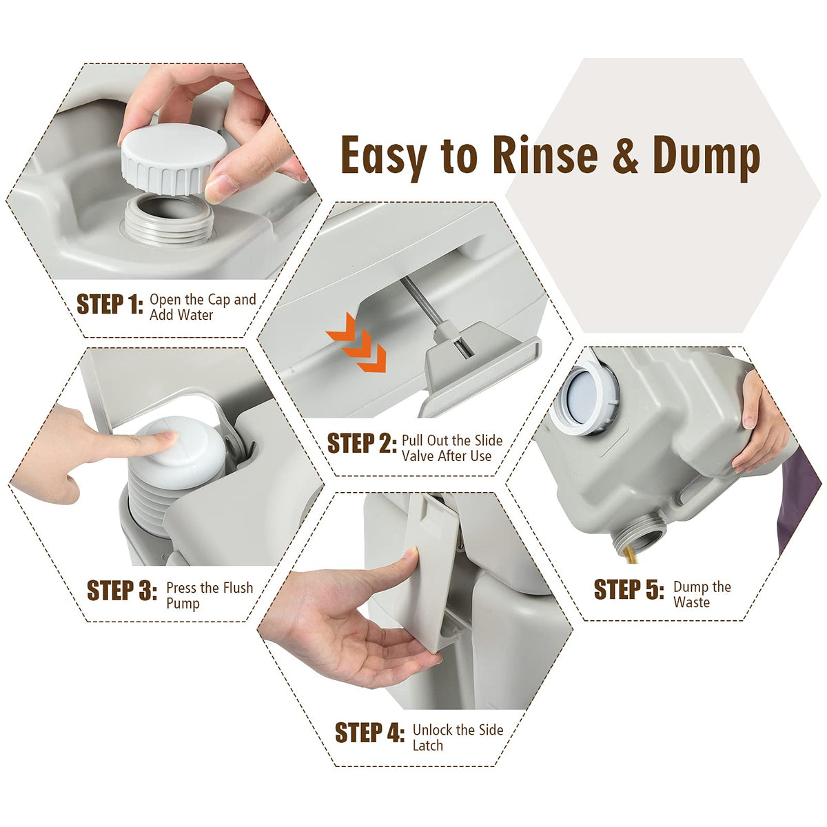 - Effective Flush & Easy Cleaning: Equipped with a flush pump, it features a self-cleaning function, just like a real home toilet. The effective spout will quickly wash away waste and leave a clean toilet for next use. After use, just open the cover of waste tank and pour waste.