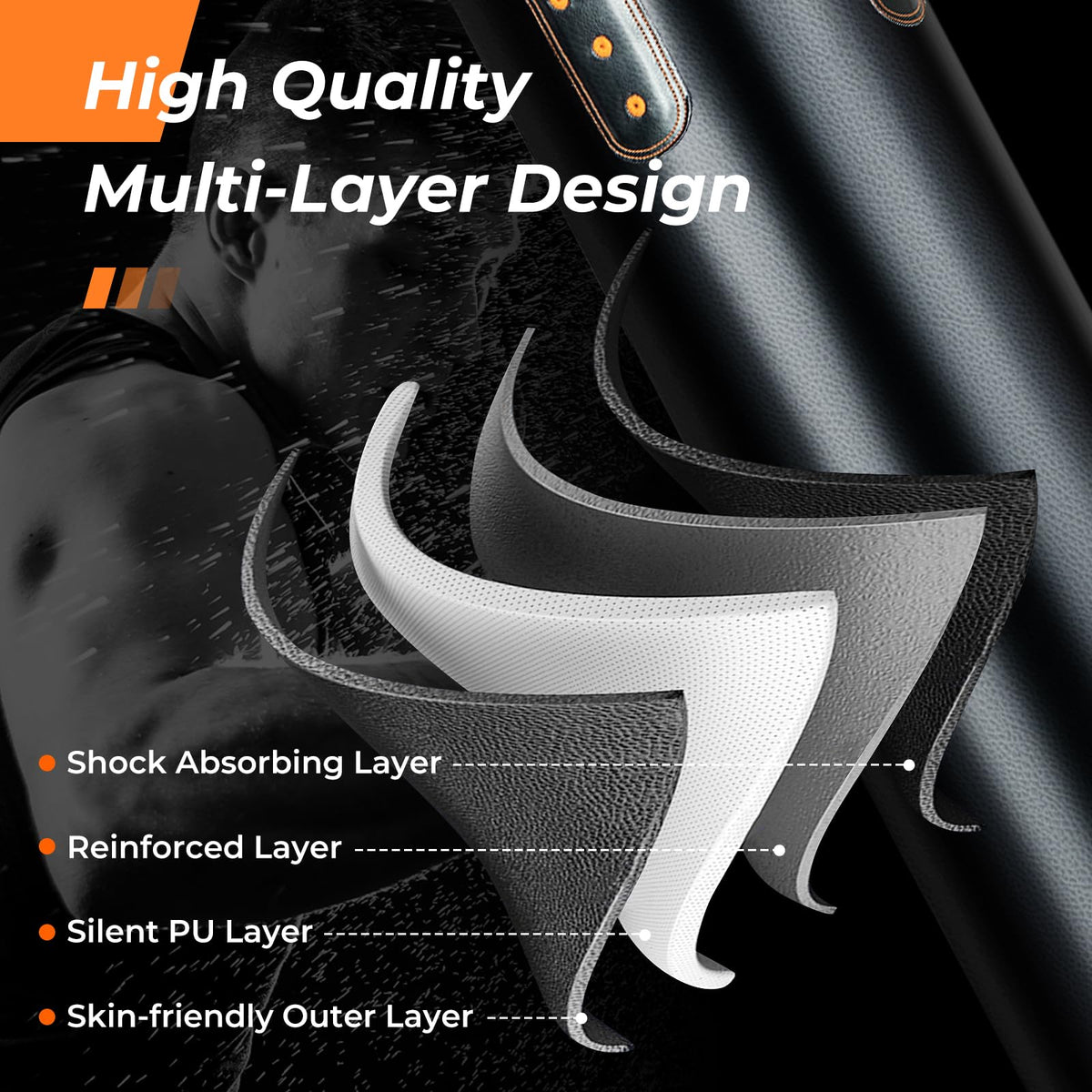 - Premium Material: Engineered with a high-quality multi-layered design, our punching bag contains skin-friendly outer layer, silent PU layer, reinforced layer and shock absorbing layer. The excellent craftsmanship ensures optimal protection under the rigors of intense training and provides long-lasting performance.
