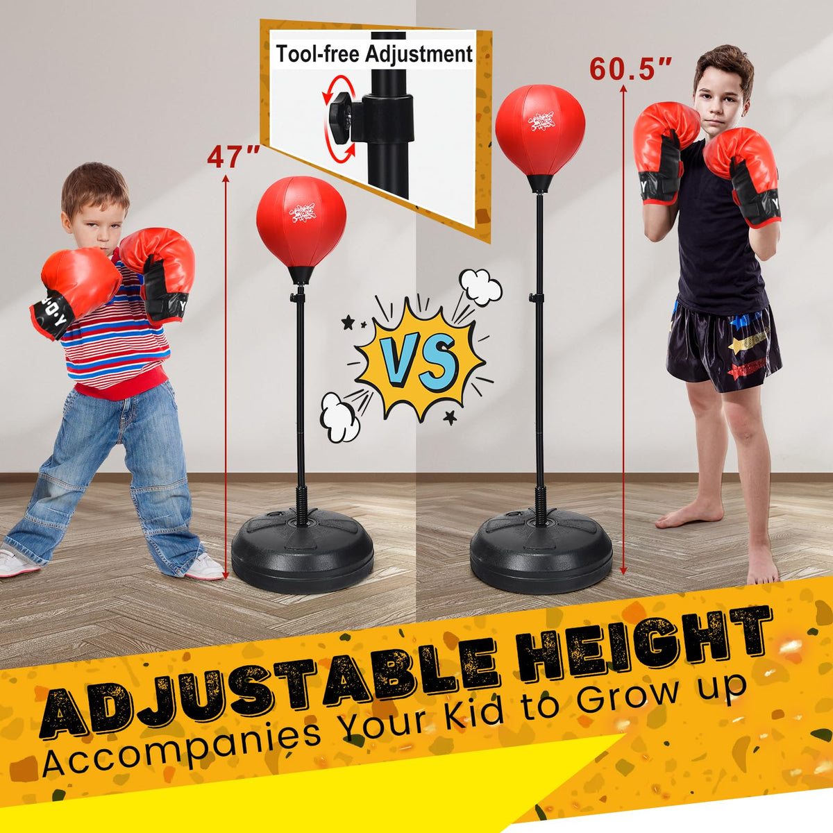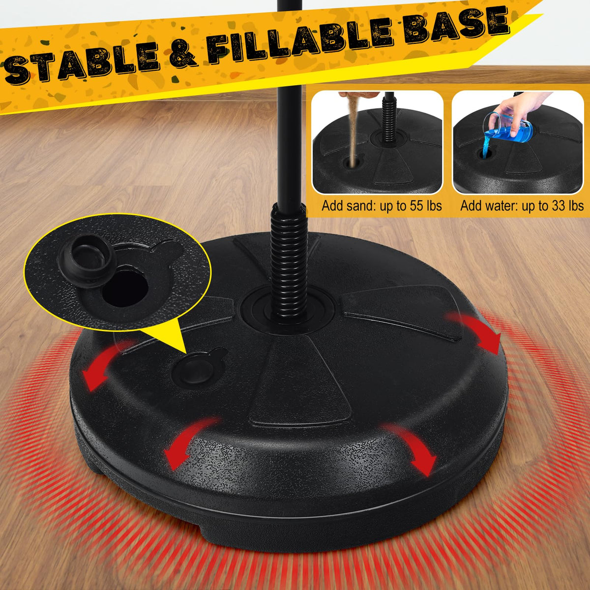 - Adjustable Height & Stable Base: With adjustable height (47"-60.5"), this boxing stand accompanies your kid to grow up. It features a tool-free adjustment for great convenience. Besides, the stable & fillable base allows you to add water up to 33 lbs or add sand up to 55 lbs in order to enhance steadiness.