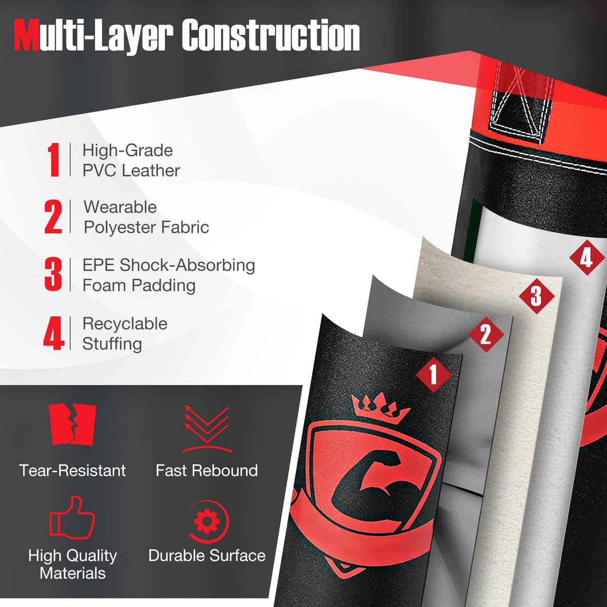 - Sturdy & Multi-Layer Construction: 4 Hanging straps are connected to the punching bag with double-row stitching for high tear-resistance. Our kids punching bag is made of high-grade PVC leather, wearable polyester fabric and shock-absorbing foam padding, which ensures fast rebound and durable and soft surface.