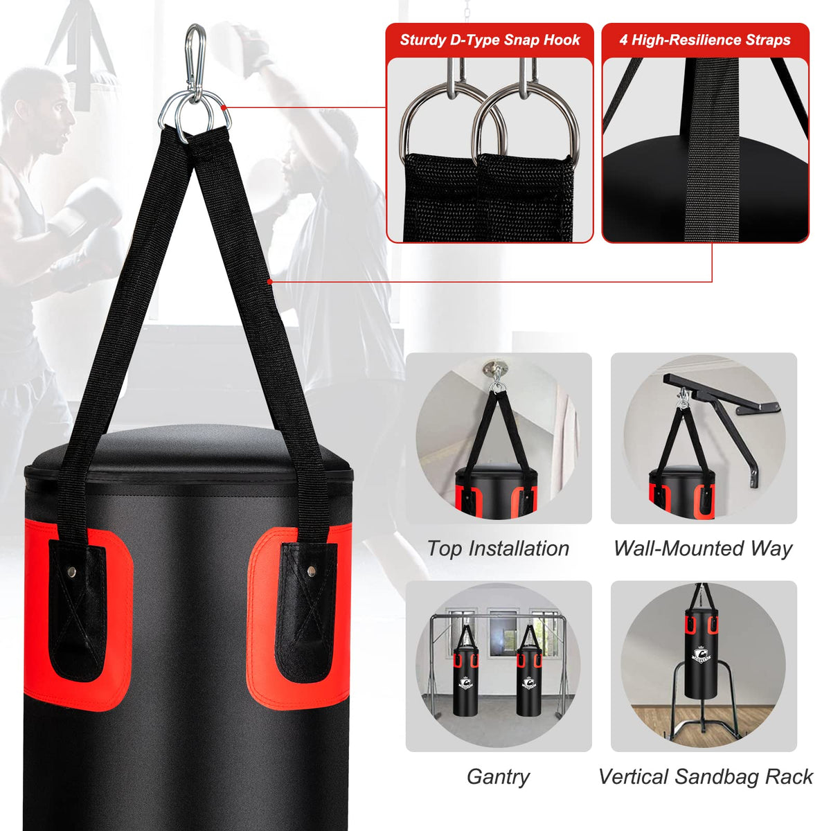 - Hang at Any Place You Want: All necessary accessories and a clear instruction included, the punching bag is easy to set up. And you can hang it in any occasions you want, such as ceiling, wall bracket or sand bag rack. More importantly, the high-grade mounting accessories and 4 tough straps will highly ensure the overall stability.