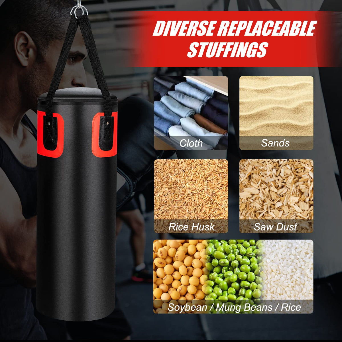 - Pre-Filled & Replaceable Stuffing: The pre-filled design of the boxing bag allows you to hit it intently as soon as you finish the installation. Also, you can replace the inside stuffing as you want with multiple items, such as cloth, sands, rice husk and saw dust. Therefore, you can easily control the bag weight for different training intensities. And the multiple stitching is effective to avoid leakage.