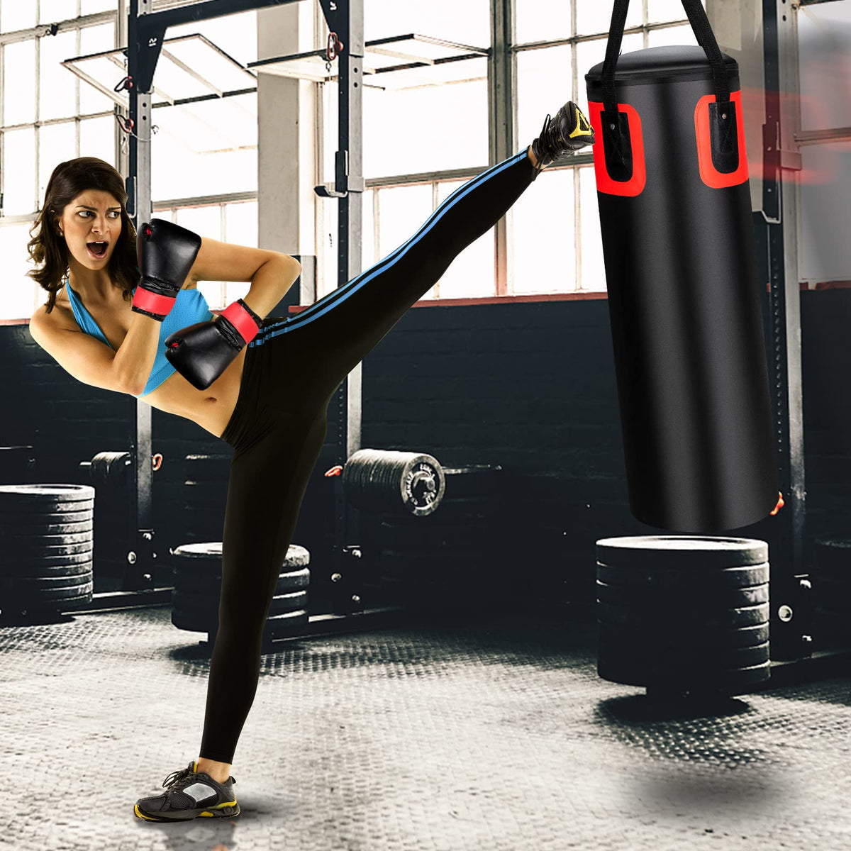 Come to relieve your work or study pressure by hitting on our heavy punching bag! This punching bag is constructed of multi-layer material for long-lasting service life. Made of selected PVC leather, the surface of the bag is resistant to ripping and quite wearable. The punching bag also features a zip-top closure design. If you want to train in a different intensity, you can change the weight of the boxing bag by removing or adding the stuffing inside. Furthermore, don't worry that frequent punching will hurt your hands, as you will be provided with a pair of 12OZ punching gloves and 2 protective hand wraps. All in all, this punching bag set will bring you a pleasant punching experience.