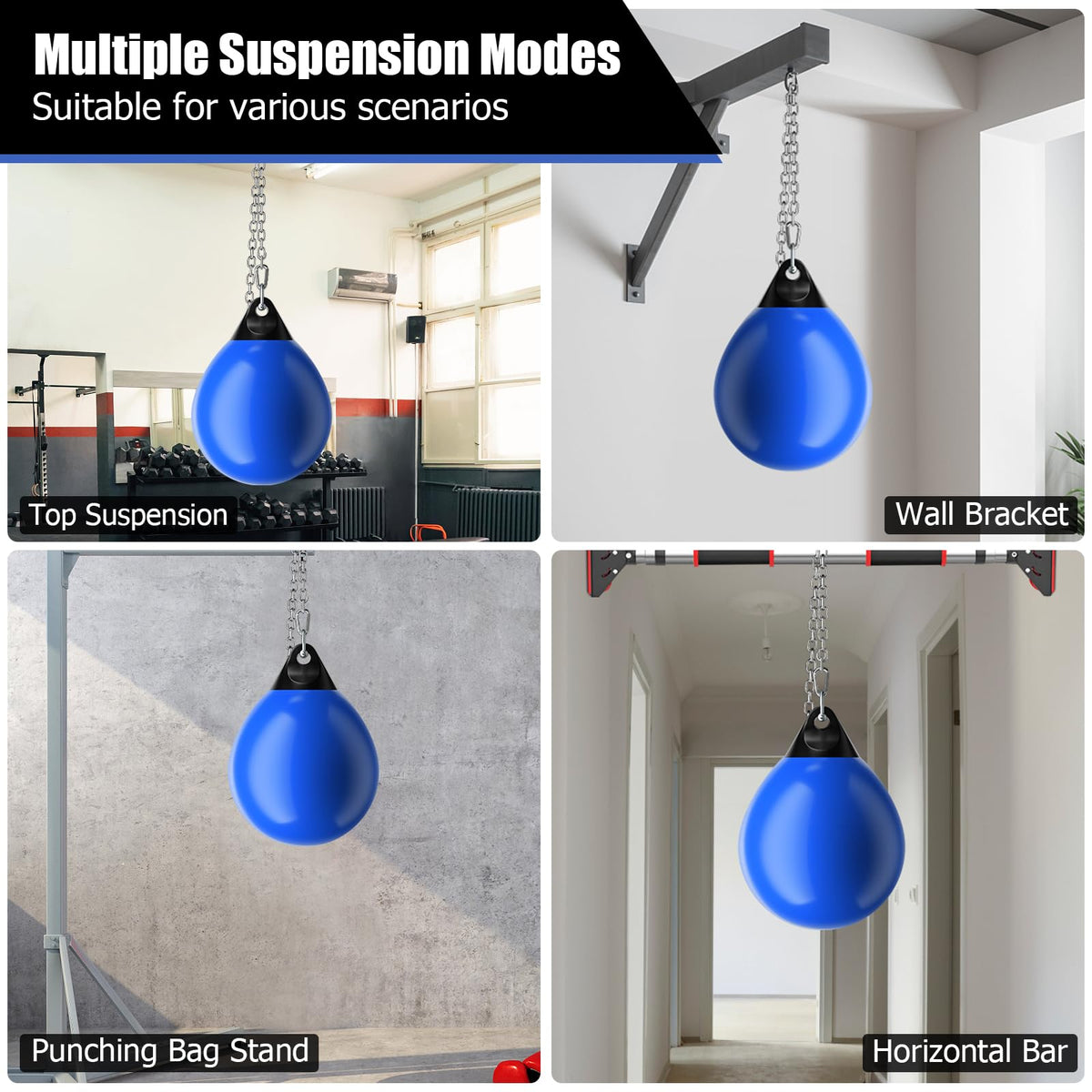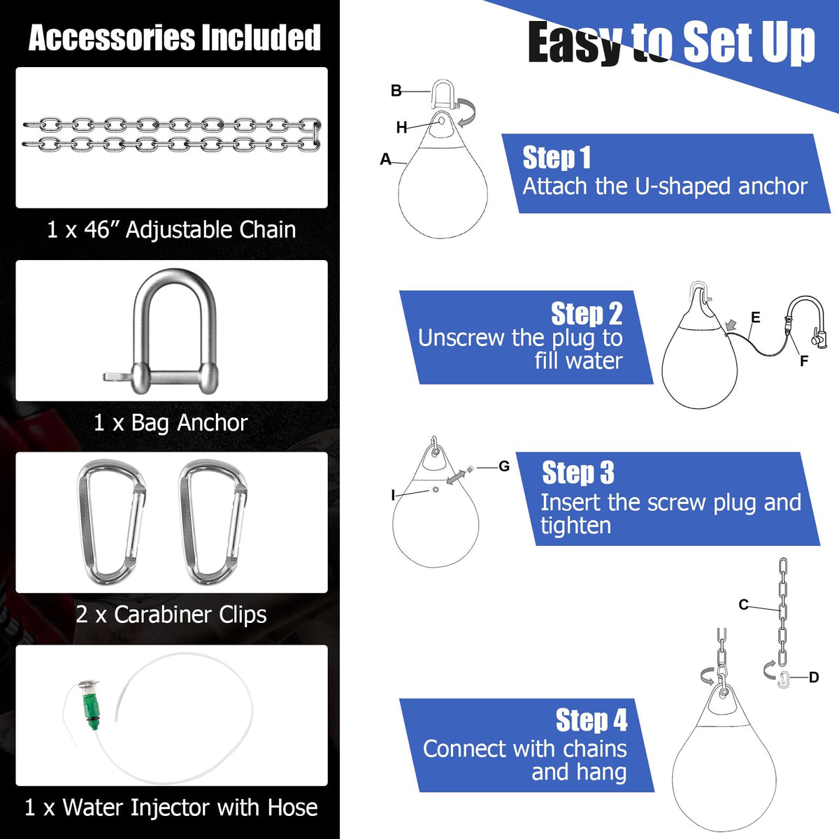- Easy to Set up & Fill: The package comes with a bag anchor, 2 carabiner clips, a chain and a water injector with hose. The water filled boxing bag is suitable for multiple suspension modes on ceiling, wall and punching bag stand. Also, the length of the chain is adjustable.