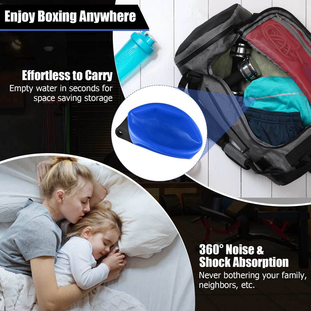 - Enjoy Boxing Anywhere: When not in use, you can empty water and air inside the punching bag so that it can be stored in cabinet or gym bag. Net weight: 11 lbs. Besides, this water punching bag is quiet during boxing, which will never bothering your family, neighbors, etc.