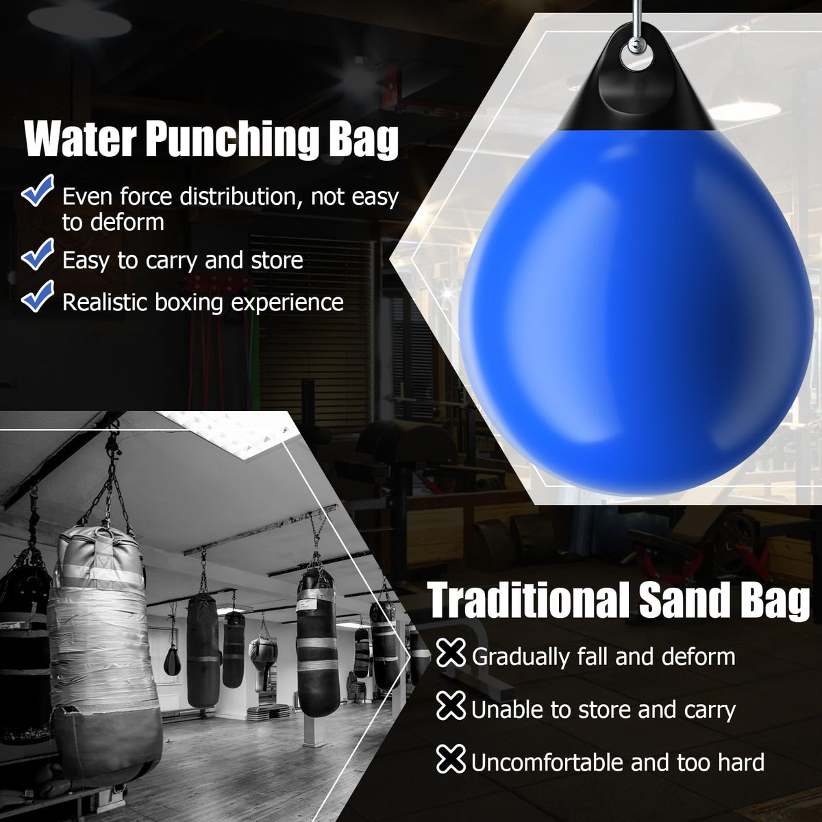 - Realistic & Comfy Hand Touch: Comparing traditional sand bag, this water filled heavy bag can easily absorb hard punches and evenly distribute the force, which makes you feel like hitting someone wearing body pads. Using wear resistant and thickened PVC material, the water heavy bag can withstand long-term onslaught.