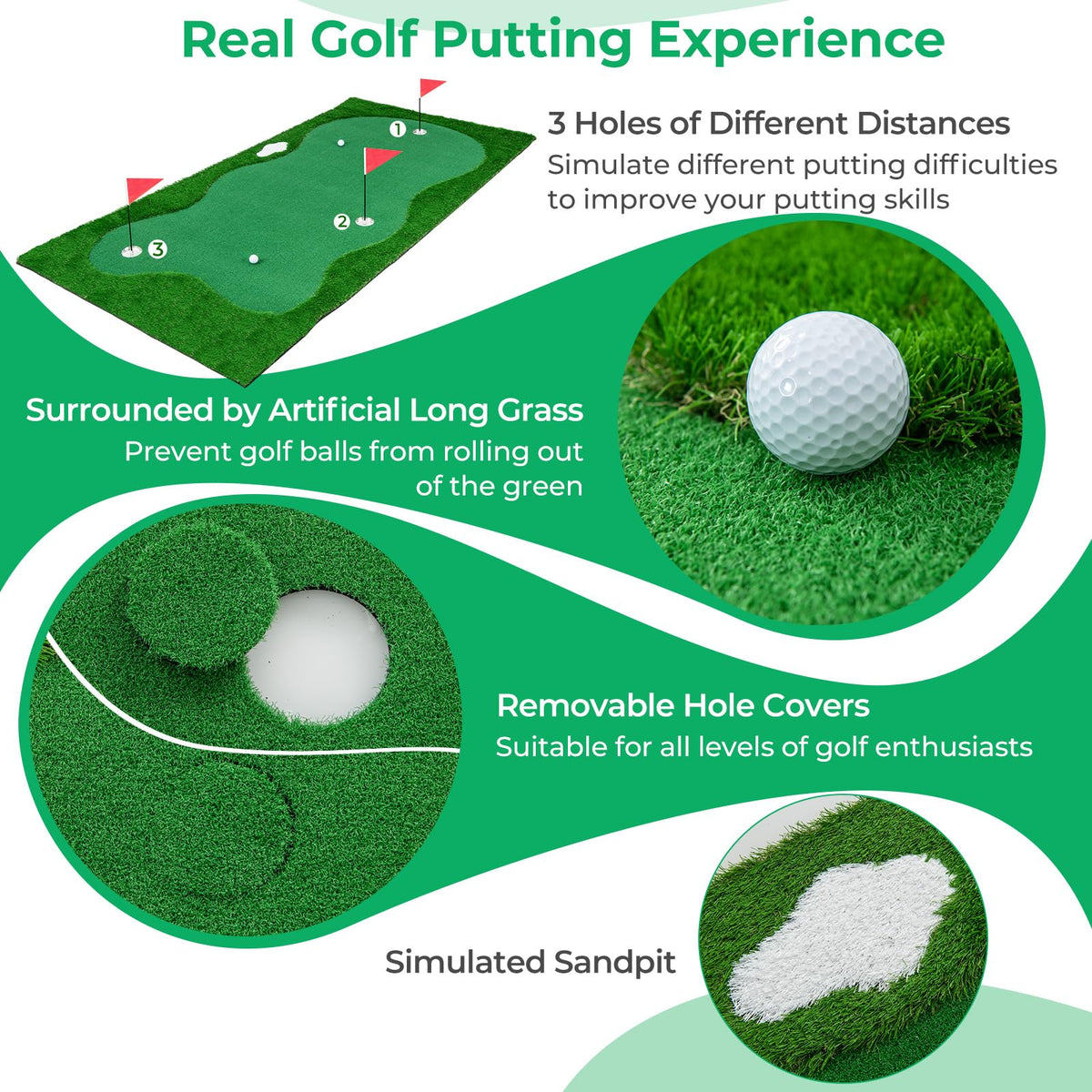 This putting training mat offers a realistic and challenging experience, with 3 holes of different distances. With the included accessories, such as golf balls, flags, golf cups, and hole covers, you can have endless fun and improve your putting skills. Moreover, the multi-layer surface,consisting of long PE grass, short PP grass and rubber base, prevents balls from rolling out and ensures a non-slip putting experience. And when you're done practicing, simply roll up the putting green and store it away. Whether indoors or outdoors, this putting mat is perfect for any golfer. Get ready to putt like a pro!