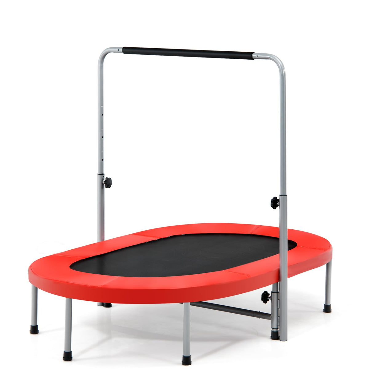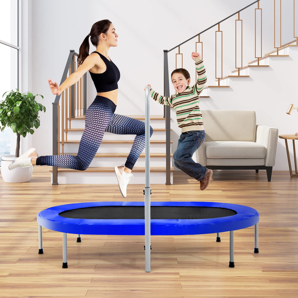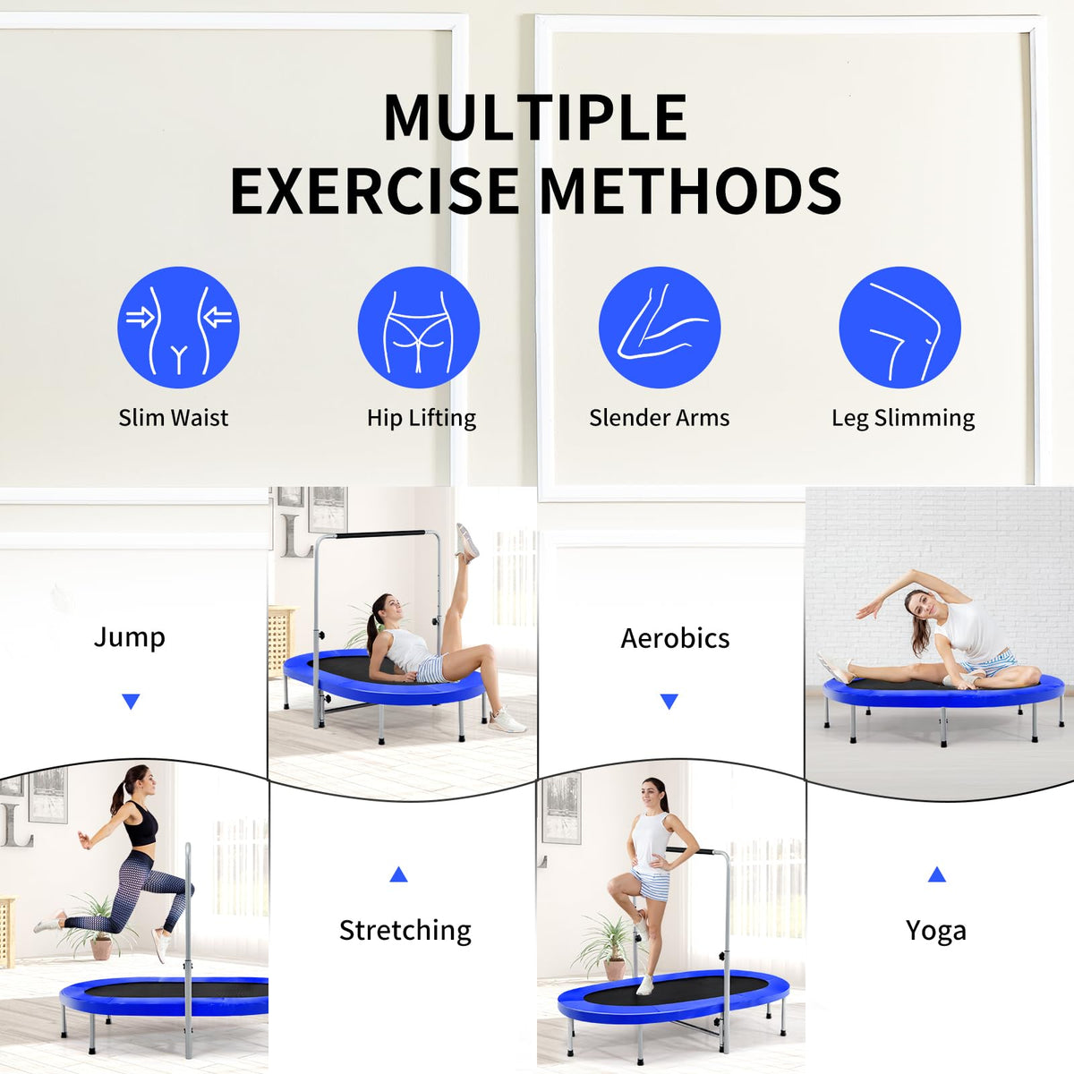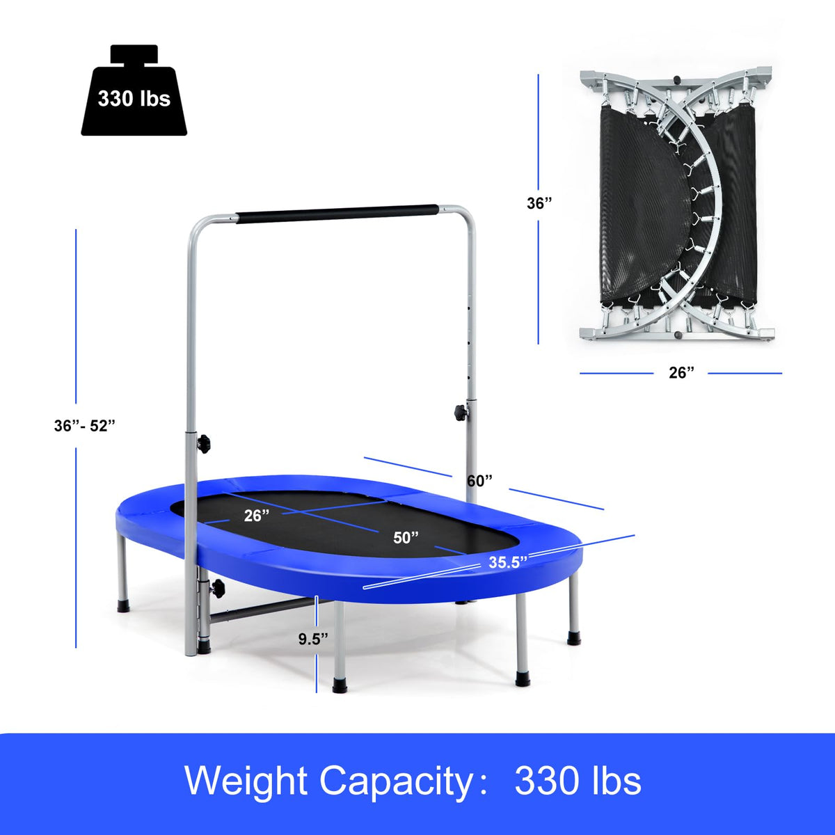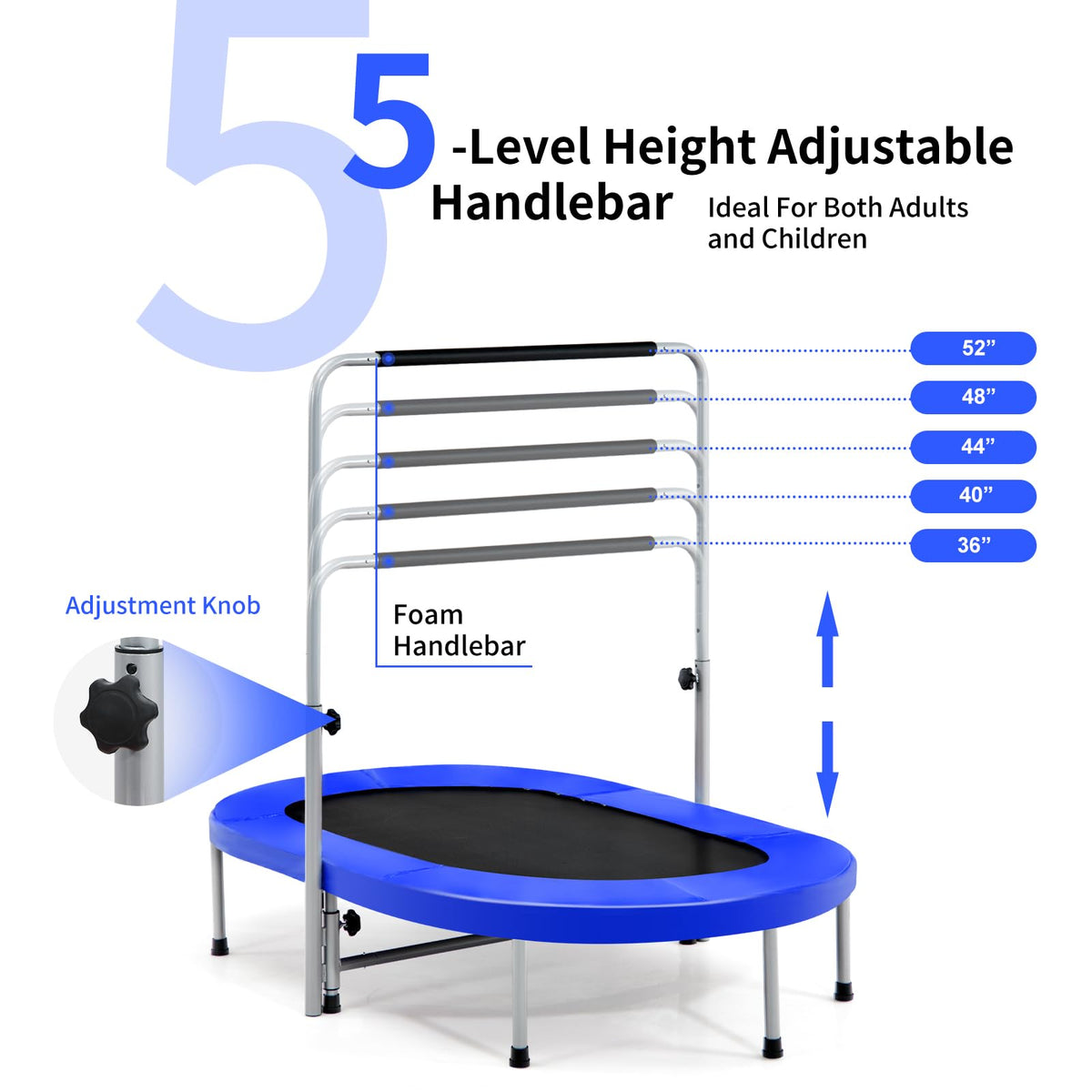 - Adjustable & Removable Handle: Featuring 5 different height (52"/48"/44"/40"/36"), the handle bar fits most heights. Meanwhile, the foam grips help to keep your balance during jumping. Moreover, you could use the folding trampoline without handle installed, offering more choice.