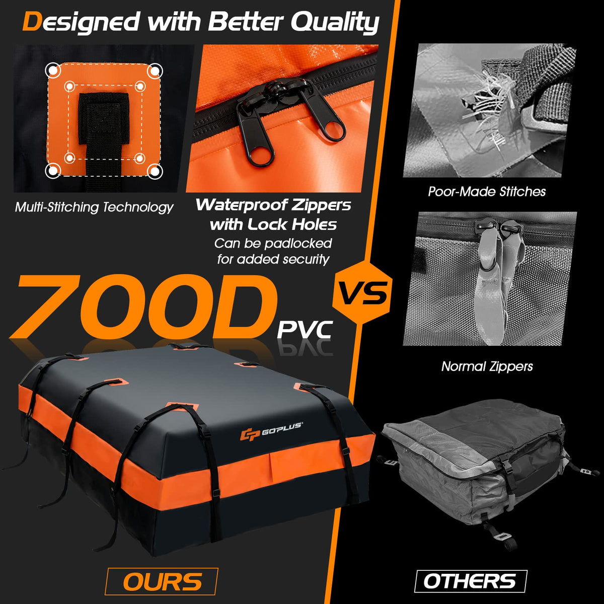 - All-Weather Material: Made of premium-quality 3-layer 700D PVC material, this rooftop cargo carrier is waterproof, snow-proof, sun proof and dust-proof, withstanding all kinds of bad weathers. What's more, waterproof double zippers and widened 4.3" zipper flap can effectively keep items inside away from dampness.