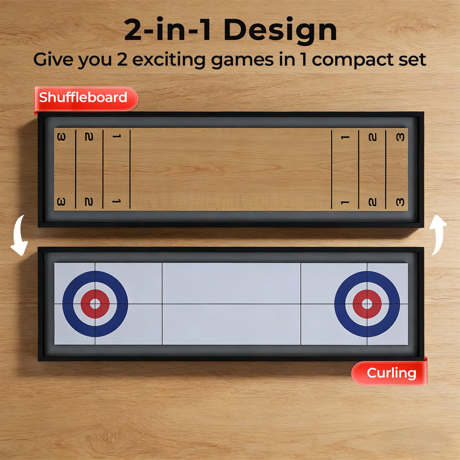 2-in-1 design for shuffleboard and curling to keep family game nights exciting
