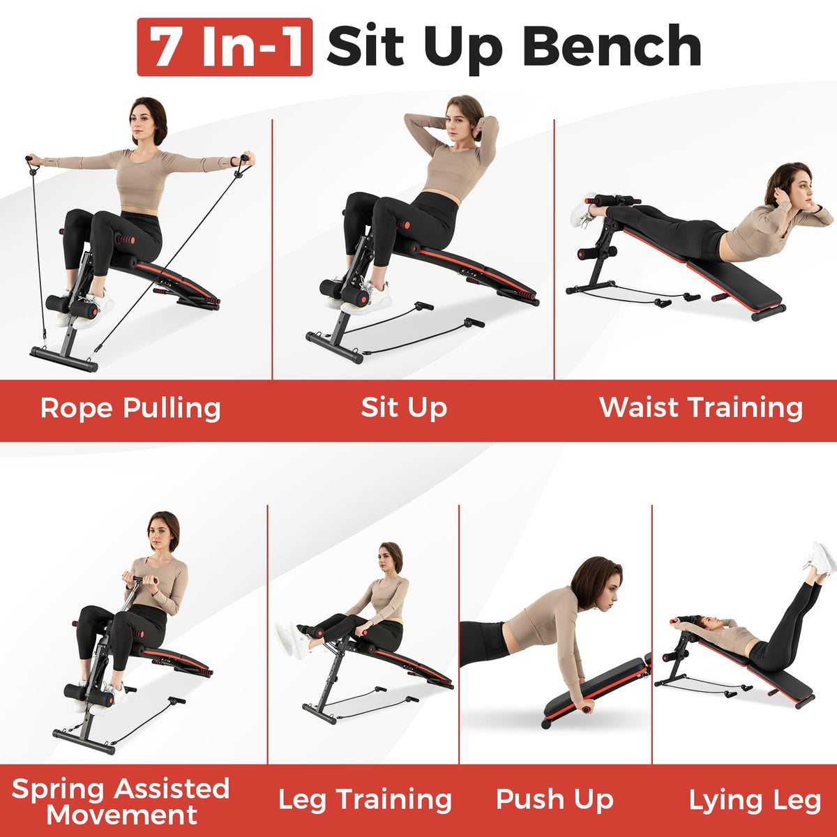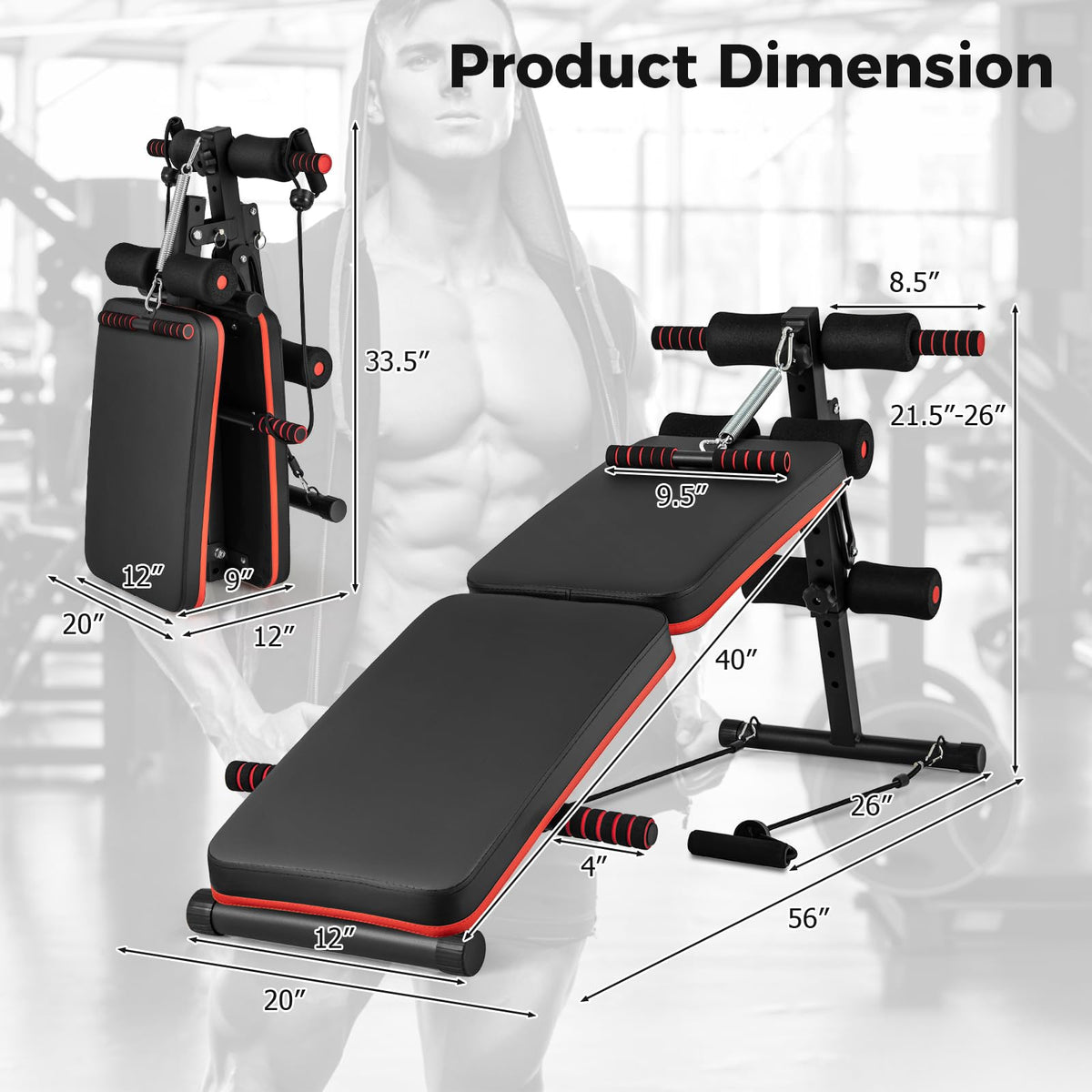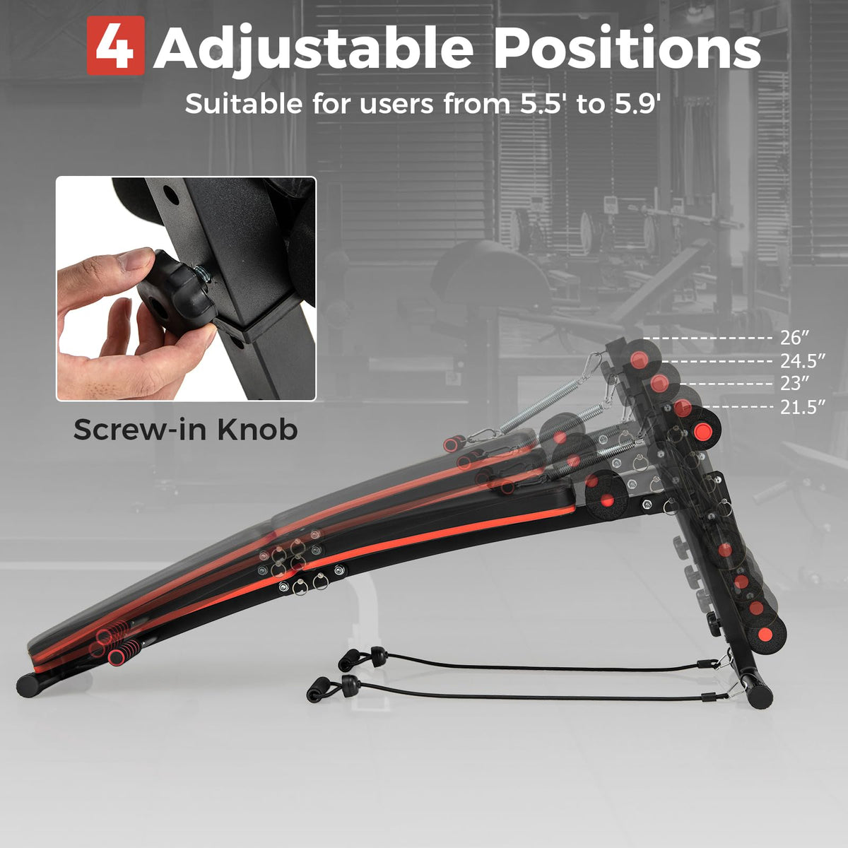 - All in One Workout Bench: With 4 level adjustable height from 21.5” to 26”, GYMAX sit up bench would fit your whole family and different workout intensity. Featuring 2 push up handles, 1 spring handle and 2 elastic ropes, this workout bench is also suitable for upper body exercise.