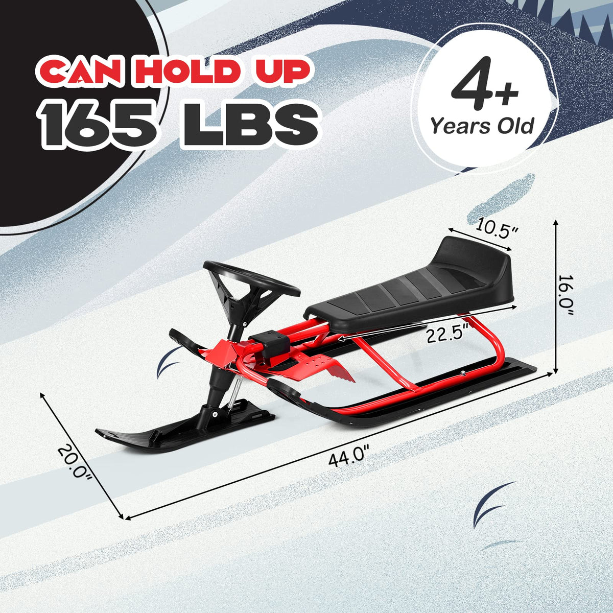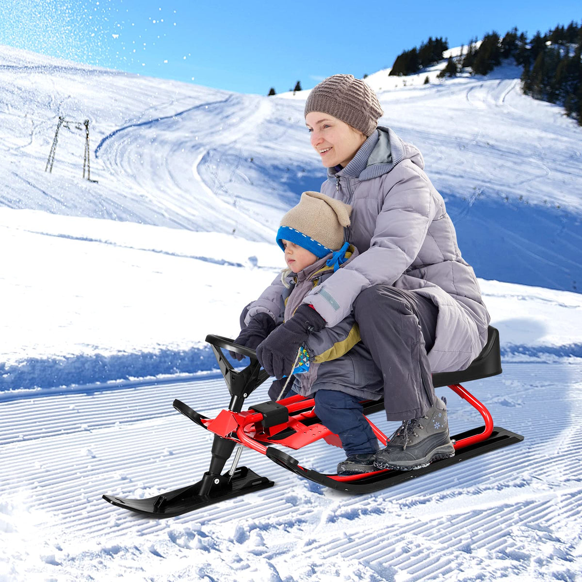 Put the safety in first place, we made this ski board with safe and premium material, providing a robust and stable construction. Kid can easily control the direction with the steering wheel and stop the ski board quickly with twin brakes. What’s more, the comfy seat provides ergonomic support and adds security. The sled is also perfect for grass and sand sliding, which bring you fun all the year.You can take this stylish ski board as a gift for your kid and use the pull rope to have fun with kid together.