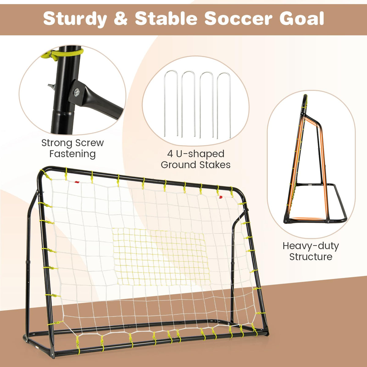 - Solid & Sturdy Structure: This soccer goal set features superior galvanized metal pipes to ensure outstanding sturdiness. Besides, the strong screw fastening and 4 U-shaped ground stakes improve overall stability and steadiness.
