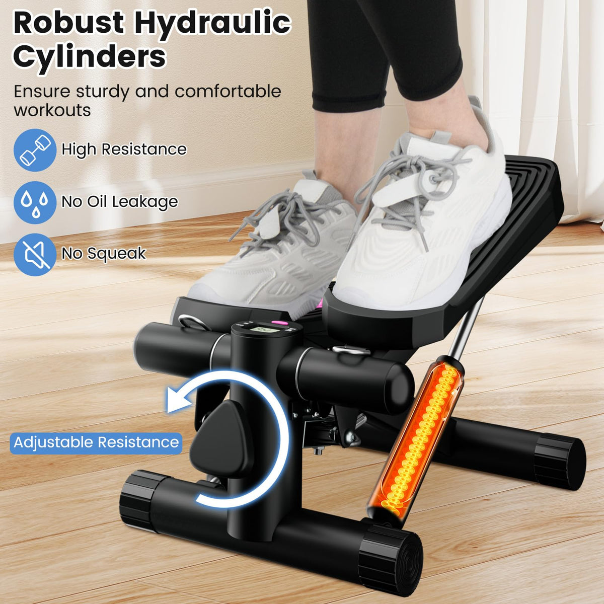 This stepper machine not only tones your legs, hips, abdomen, and arms with the included resistance bands but also customizes to your workout intensity with adjustable stride heights. The hydraulic cylinders offer smooth stepping, ensuring sturdy and comfortable workouts. Additionally, the real-time data displayed on the LCD monitor allows precise tracking of your exercise regime. Weighing merely 12 lbs, the stepper is remarkably portable and operates silently at 10 dB, making it the perfect home workout equipment.
