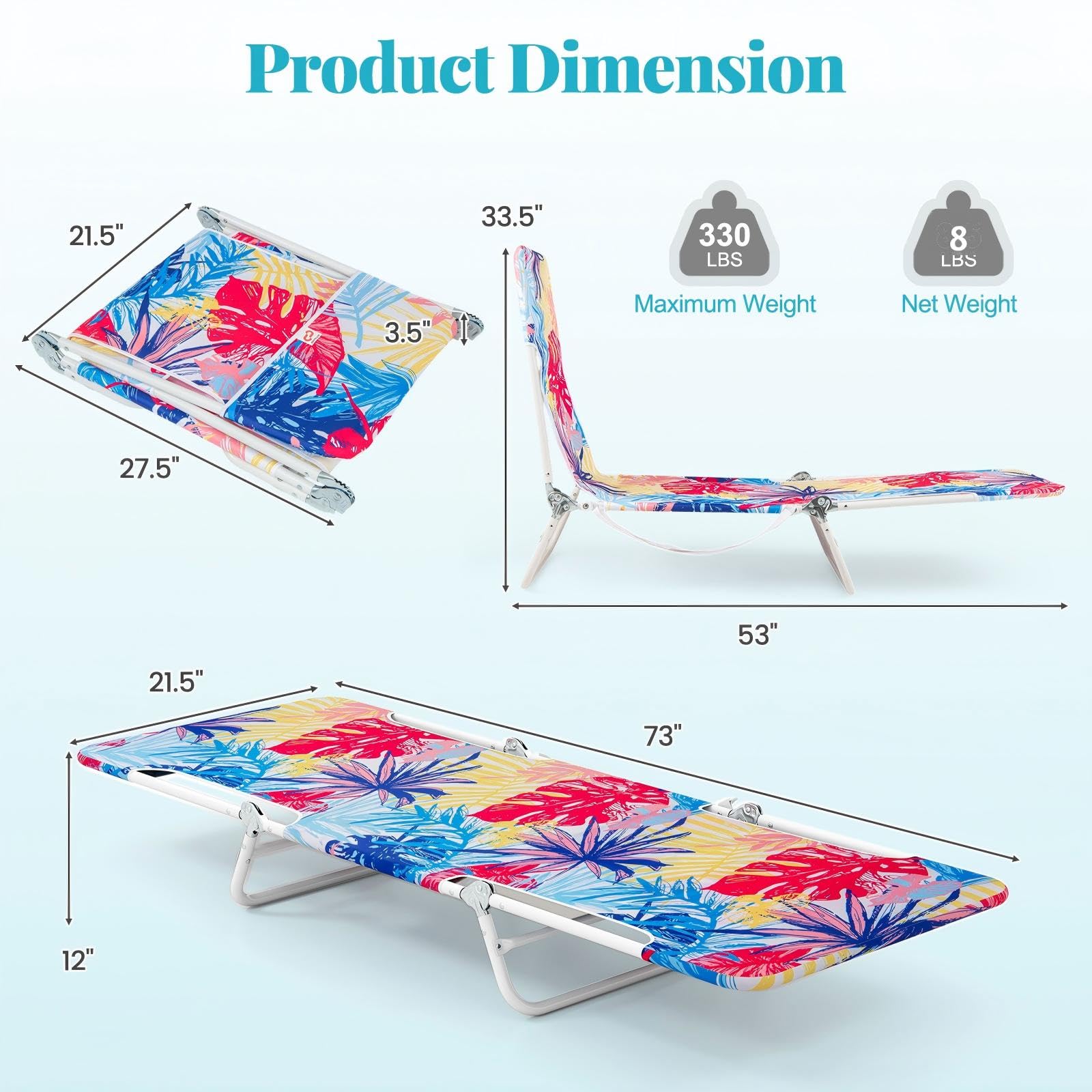 Our adjustable lounge chair is designed for ultimate relaxation, featuring 5 backrest positions (180°, 160°, 140°, 120°, and 100°). This camping chair is made from breathable, wear-resistant fabric that keeps you cool and comfortable, even on summer days. Additionally, its sturdy U-shaped frame with reinforced cross bar is sturdy and solid, supporting up to 330 lbs. Besides, the lightweight design (only 8 lbs) and convenient shoulder strap make it easy to carry, whether you're heading to the beach, pool, or backyard.
