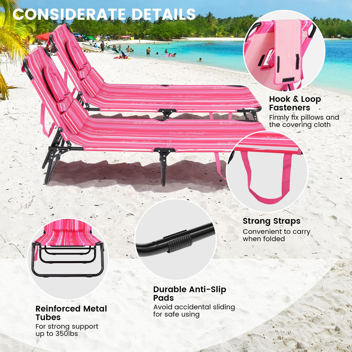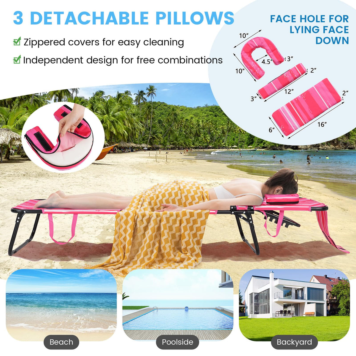 - 3 Removable Pillows & Face Hole: GYMAX face down tanning chair features 3 detachable pillows which can be taken down and washed separately. You can pillow on your beach chair to enjoy the sun and tan your skin more beautifully. You can also drink juice on your stomach and enjoy this leisure time. With hook and loop fastener, you can attach the pillow to the back if you don't want to use it.