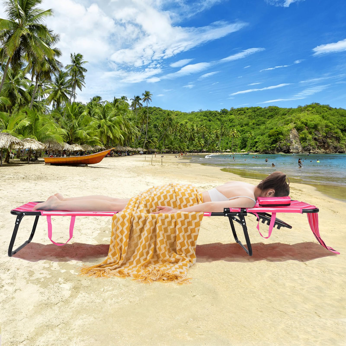 - A Summer Essential & Higher Design】Summer is around the corner, are you looking for a tanning chair with face hole for your holiday? Your patio, pool, lawn, garden, backyard, balcony are all missing layout chairs for tanning! GYMAX beach chair can work as sun lounger in sunbathing or camping, but also a flat cot for napping in office or a spare bed for friends. 12’’ in height, you won’t feel hard to get up after long lying.
