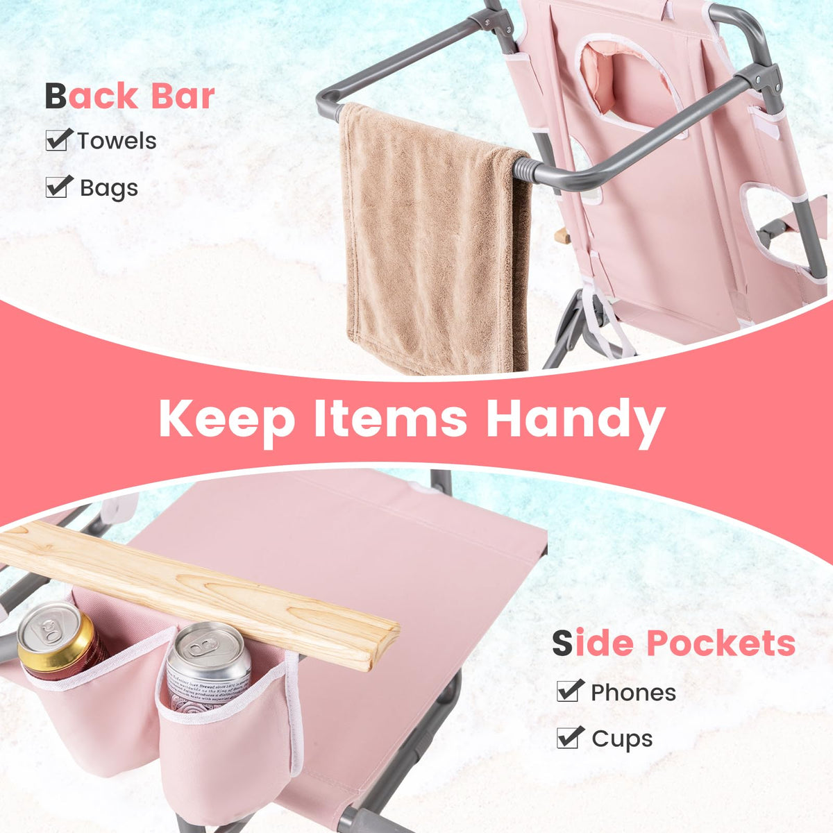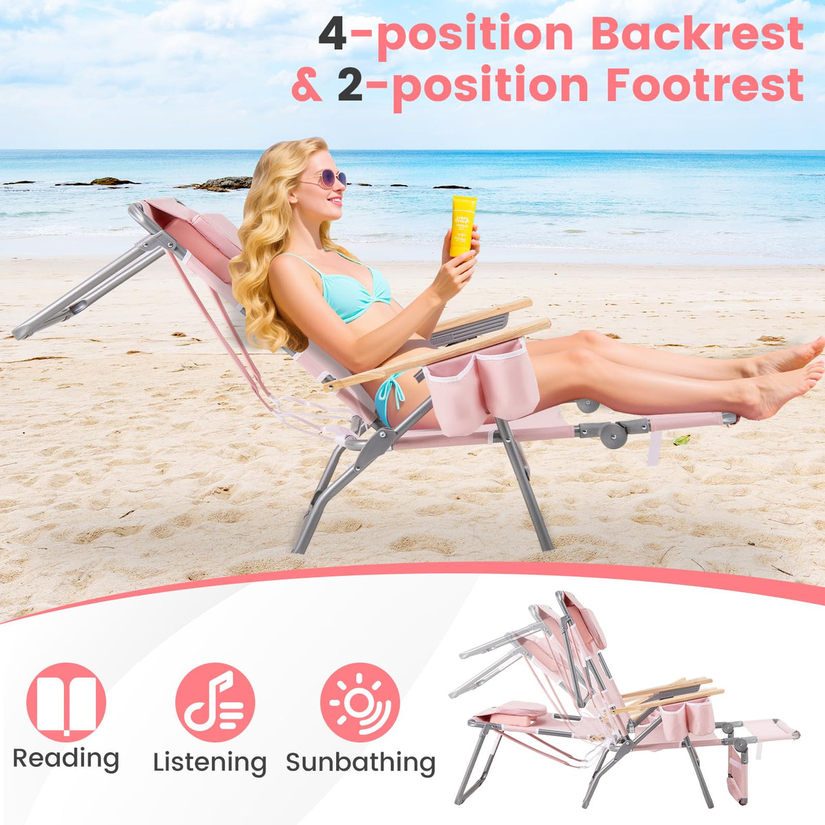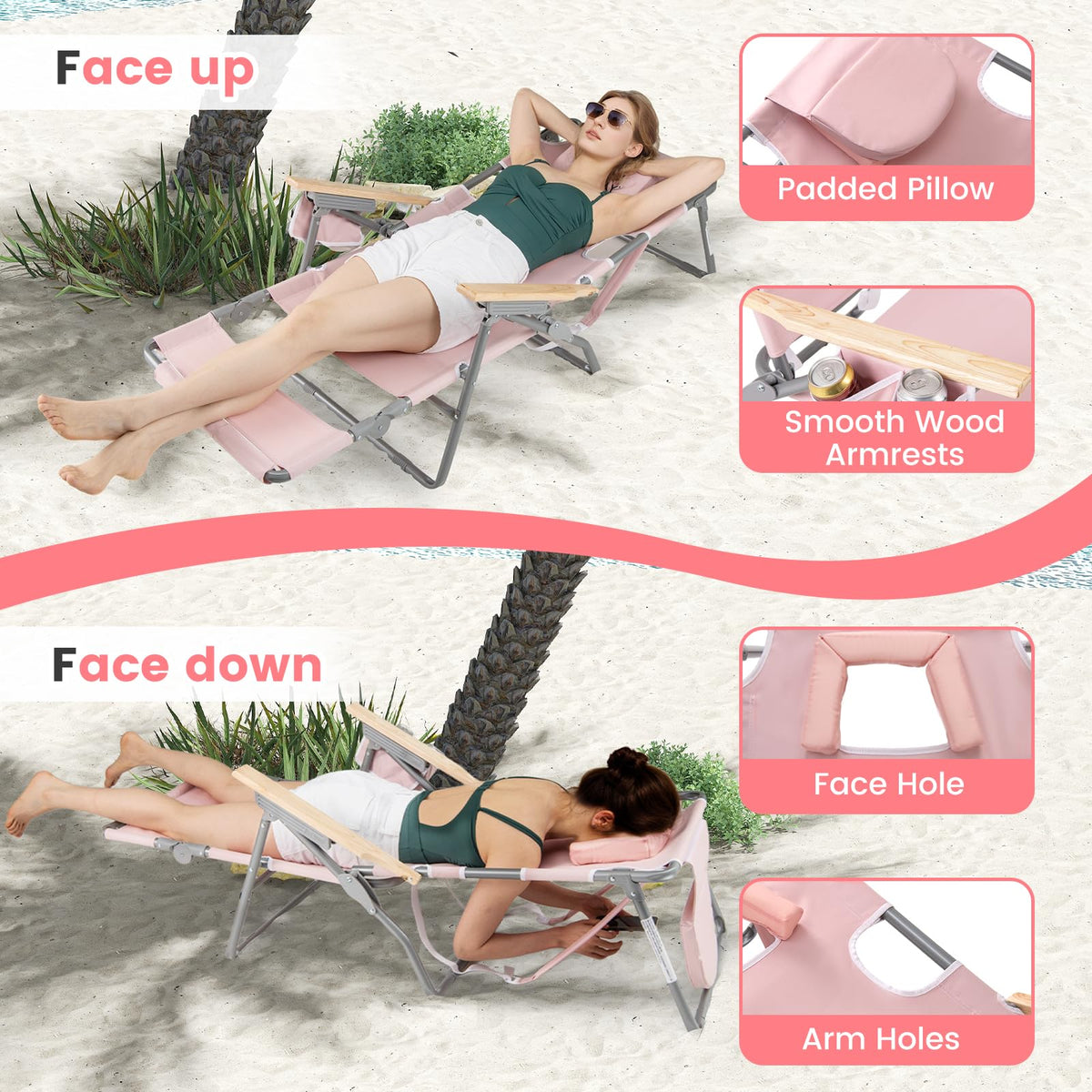 It boasts adjustable features, allowing you to switch effortlessly between 4 backrest positions and 2 footrest positions for customized comfort. What’s more, whether you prefer to recline or flip over for a nap with your face down, the beach chair caters to your demands. The built-in pillow offers an added touch of luxury while you unwind, and the face hole and arm holes enhance your comfort when you choose to lie face down. The robust metal frame with anti-slip foot pads confidently supports up to 330 lbs, coupled with high-quality oxford cloth, the tanning chair promises durability and reliability across various outdoor conditions. Additionally, the 2 pouches and a back rack ensure items you need are always within arm's reach. Plus, the lightweight yet sturdy chair folds quickly for easy transport, making it an ideal companion for adventures.