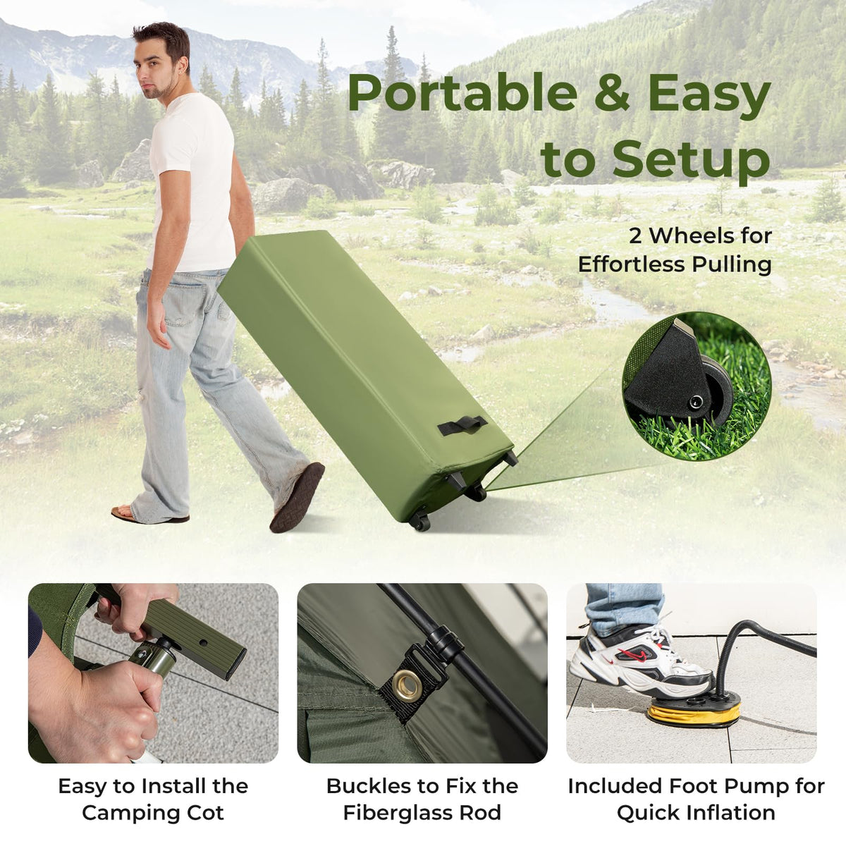 - Portable & Easy to Install: Coming with wheeled carrying bag, you can effortlessly store and transport the foldable camping combo. With fixing buckles, the tent can be set up with ease. And you can quickly inflate the mattress with foot pump. Or you can use other electric pumps(excluded) to inflate.