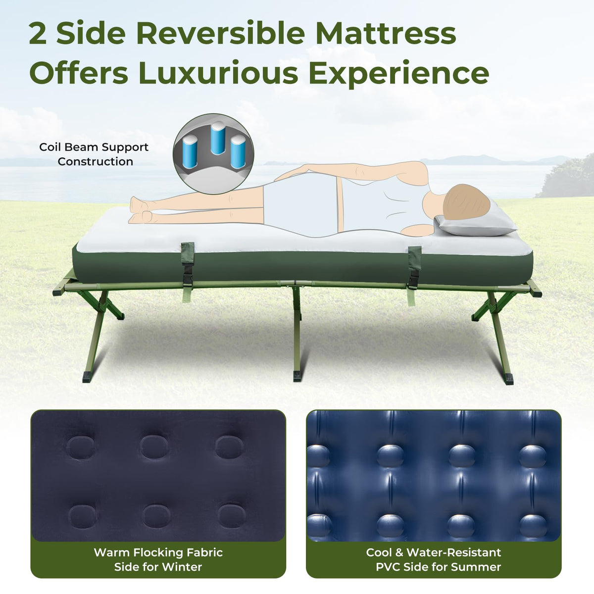 - Upgraded Reversible Mattress: Coming with a mattress with coil beam construction, the folding camping tent will provide even and firm support for your spinal. Besides, the dual-use mattress features warm flocking fabric for winter and cool, water-resistant PVC for summer.