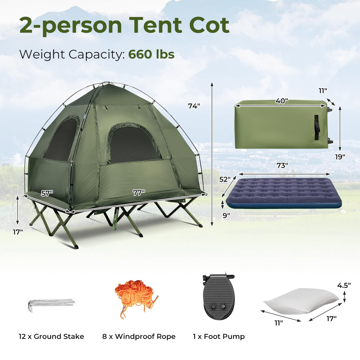 - 5-In-1 Camping Tent Combo: The 5-in-1 camping tent cot is a complete set for sleeping out, including a tent, a camping cot, 2 sleeping bags, an air mattress and 2 air pillows(with cover), which can be combined for hiking, backpacking or camping. Or you can separately use them for personal needs!